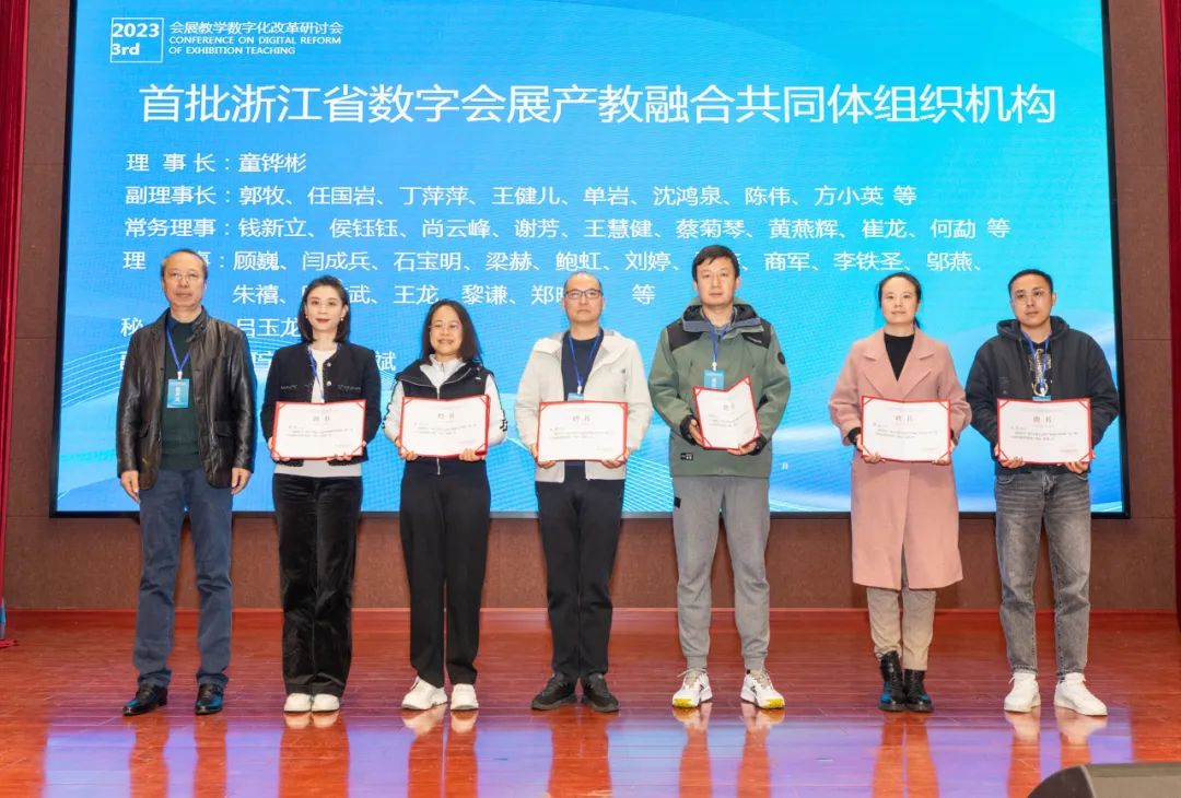 会议期间还举行了“浙江省数字会展产教融合共同体”成立仪式,并为首批“共同体”理事成员颁发聘书,以及由浙江农业商贸职业学院与浙江易启莱朗顿教育科技有限公司共建的“易启莱数智会展产业学院”揭牌仪式。我校刘婷老师获聘为首批“共同体”理事成员。
