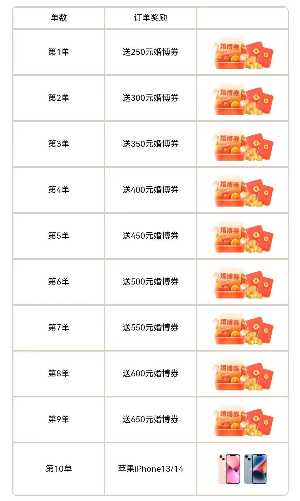 索票或注册成为婚芭莎会员,系统会根据婚博券的勾选需求,为您自动下发100-650元共11张婚博券。此时的婚博券还未激活,100元和200元婚博券需要选择心仪商家激活后使用。后续每录入一个不同类别的订单,审核通过后,就可以激活下一张更高面额的婚博券,在下一个订单时使用。