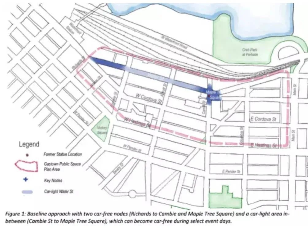 根据这份包含城市规划地图的备忘录,再往东,在枫树广场,卡罗街(Carrall St.)的水街部分路段也将关闭,并在甘比街夹卡罗街之间将设一条“汽车灯”通道。