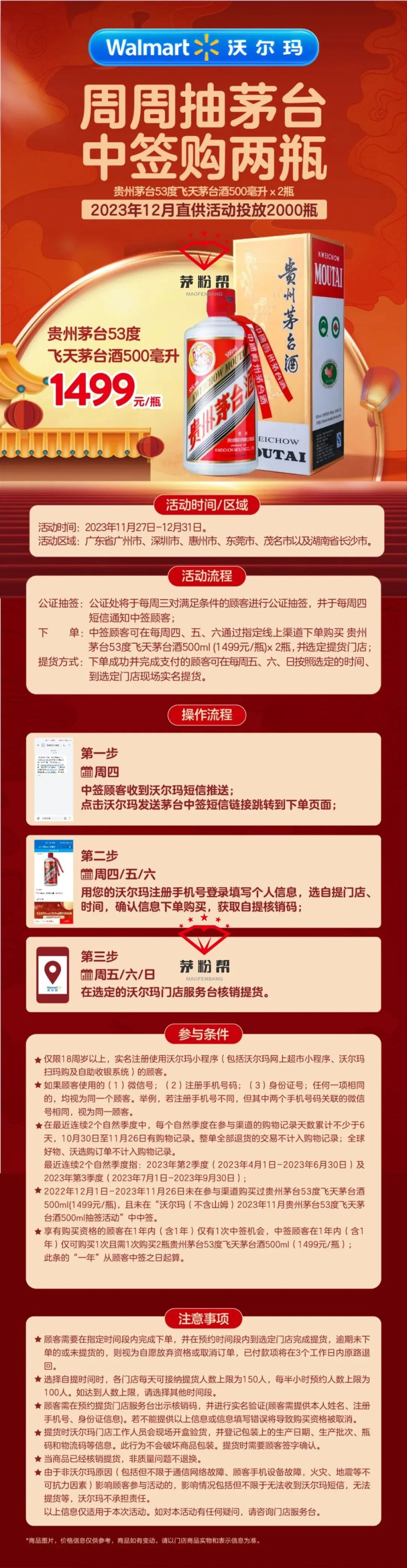 沃尔玛12月1499贵州飞天茅台酒预约抽签活动开启了!