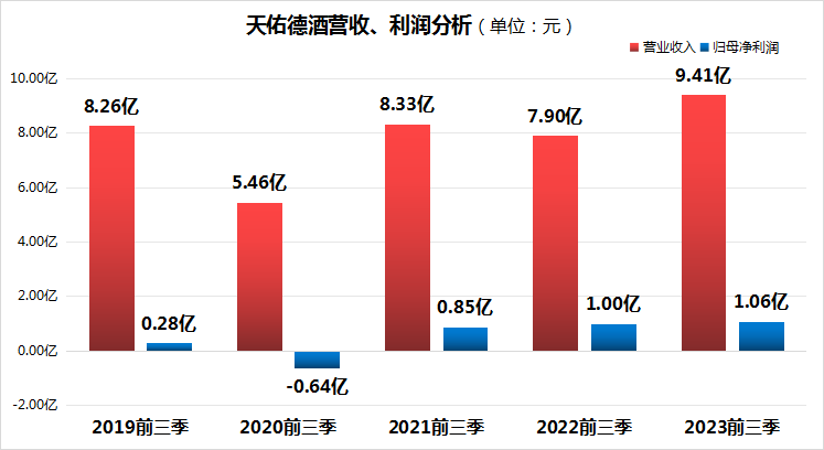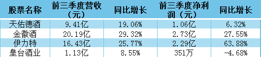 据天佑德酒三季度报告显示,公司第三季度营收约为2.8亿元,同比增长43.81%,前三季度营收约为9.4亿元,同比增长19.06%;第三季度归母净利润约为9.45亿元,同比增长1682.25%,前三季度归母净利润约为1.06亿元,同比增长6.32%。