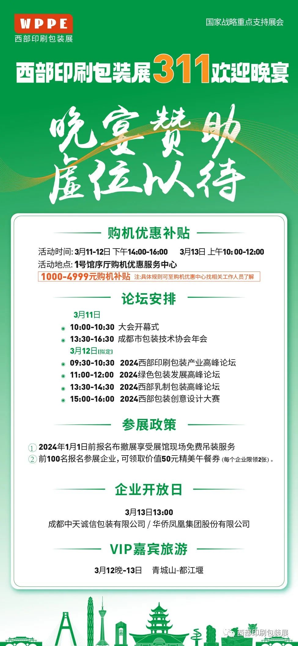 2024中国西部(成都)国际印刷包装全产业博览会将围绕工业 4.0 与打造展示、体验、交流、交易四个平台,集中展示印刷包装行业新材料、新设备、新技术、新工艺、新产品,展会旨在为参展商及印刷包装业人士提供一个更好的展示和交流的平台。本届展会以“印前设备、印后设备、瓦楞纸箱、包装制品、标签印刷、包装容器”六大领域和西部印刷包装文化节专区为特色,必将是一次高层次、大规模、影响深远的盛会。本届展会展览规模预计 30000 平米,展商 500 家左右,专业观众预计30000人次,展览期间还将举办西部包装行业发展大会、主旨论坛产品发布会等活动。