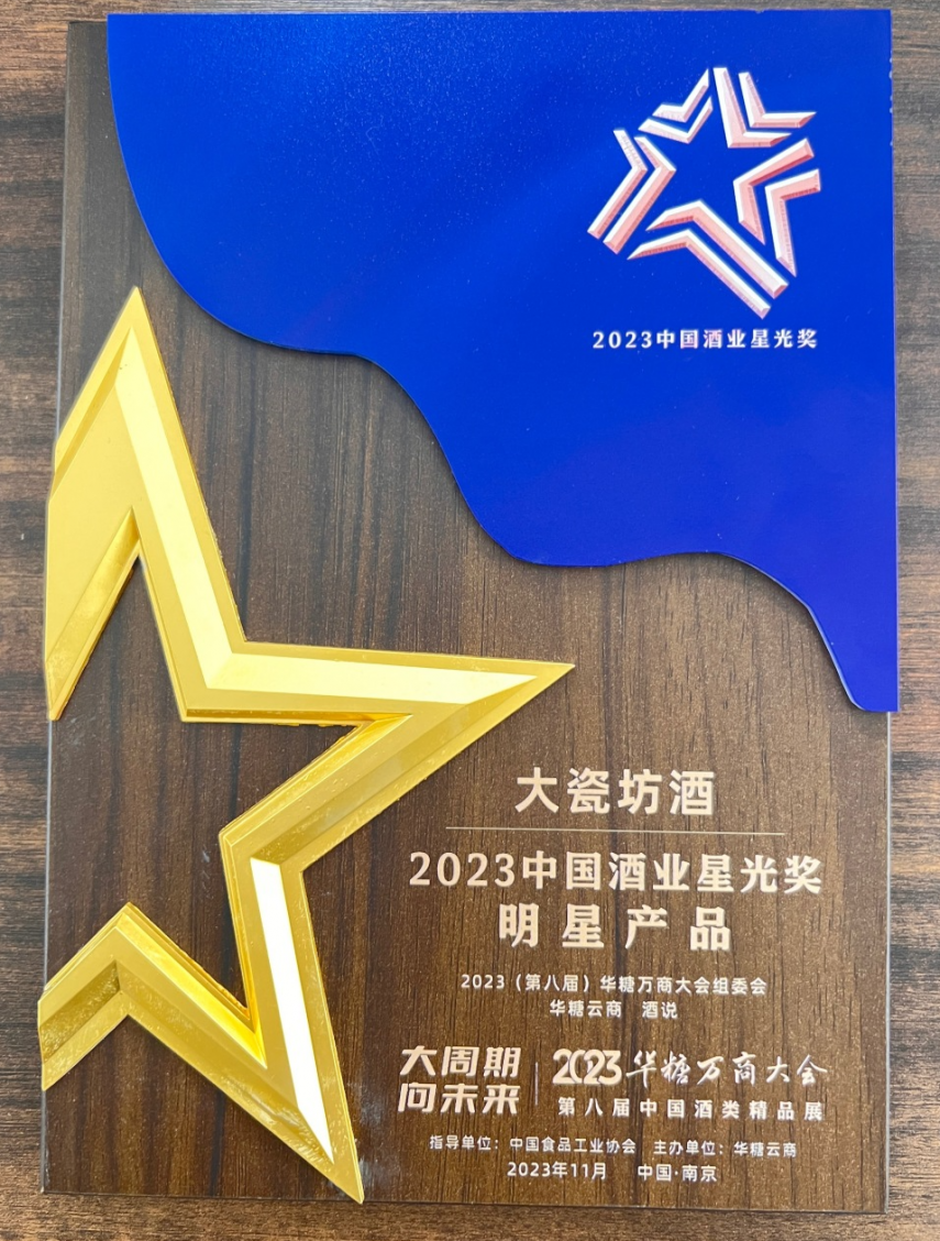 2023年11月28日下午,在南京新华传媒国际酒店举办的“超级品牌超级增长——新名酒品牌价值论坛暨2023中国酒业星光奖颁奖盛典”上,大瓷坊酒再获殊荣,成为2023中国酒业星光奖明星产品得主。本次颁奖盛典由中国食品工业协会指导、华糖万商大会、华糖云商主办、糖酒周刊、食业头条媒体支持。