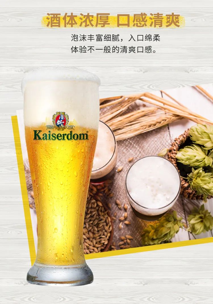 kaiserwin(凯撒啤酒)为德国著名啤酒品牌之一,严格按照德国巴伐利亚1516啤酒酿造法酿造· 喝起来就好像刚从酒桶中取出般新鲜,有着混合了啤酒花和谷物味道的复杂香气,容易入口,略带酸涩的的味道让人着迷。