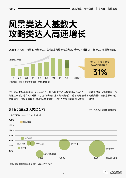 b.旅行达人类型丰富多样,2023年9月,旅行风景类达人数量超过2.5万人,在抖音平台发布旅途风光,从增速上来看,今年9月对比1月,旅行攻略类达人增长超1倍,随着交通基础设施的完善以及信息获取更加透明便捷,选择自驾自助出行的人越来越多,许多人在抖音观看旅行攻略,开启旅行。