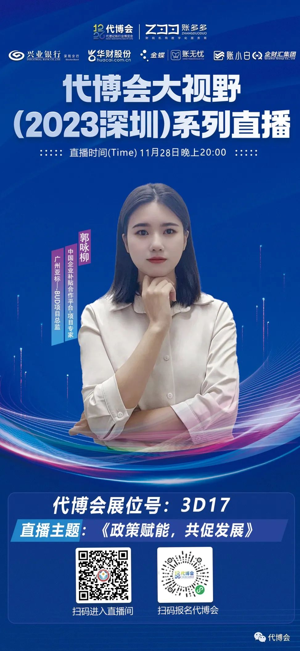2023年11月28日晚上8点,本期为“1226代博会大视野”系列直播的第二十二期,特邀嘉宾为惠州代账协会秘书长单位、广州亚标—BUD项目总监郭咏柳,分享《政策赋能,共促发展》。本期【深圳市代理记账行业协会】视频号多人观看,感谢同行朋友一如既往的支持和收看。
