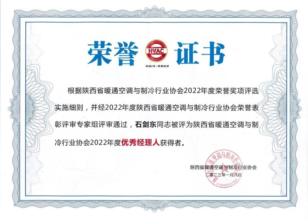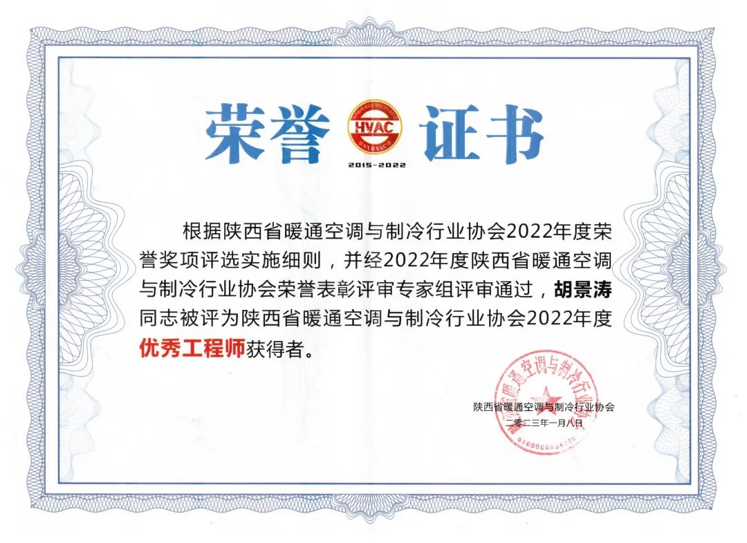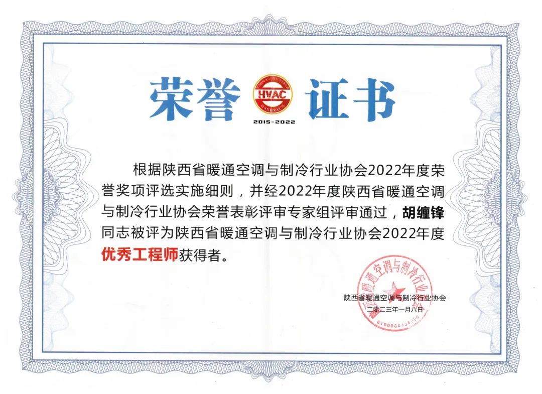 其中,集团申报的两项课题荣获“陕西省暖通空调与制冷行业协会2022年度技术创新奖”,设备安装工程公司荣获“陕西省暖通空调与制冷行业协会2022年度先进单位”荣誉称号,晋城丹河新城项目商务中心A区安装工程项目负责人石剑东被评为“2022年度优秀经理人”,未来之瞳·瞳系列建筑大剧院项目安装工程技术负责人胡景涛、上海大名城临港奉贤B10-02地块项目安装工程现场项目负责人、技术总工胡缠锋2人被评为“2022年度优秀工程师”。