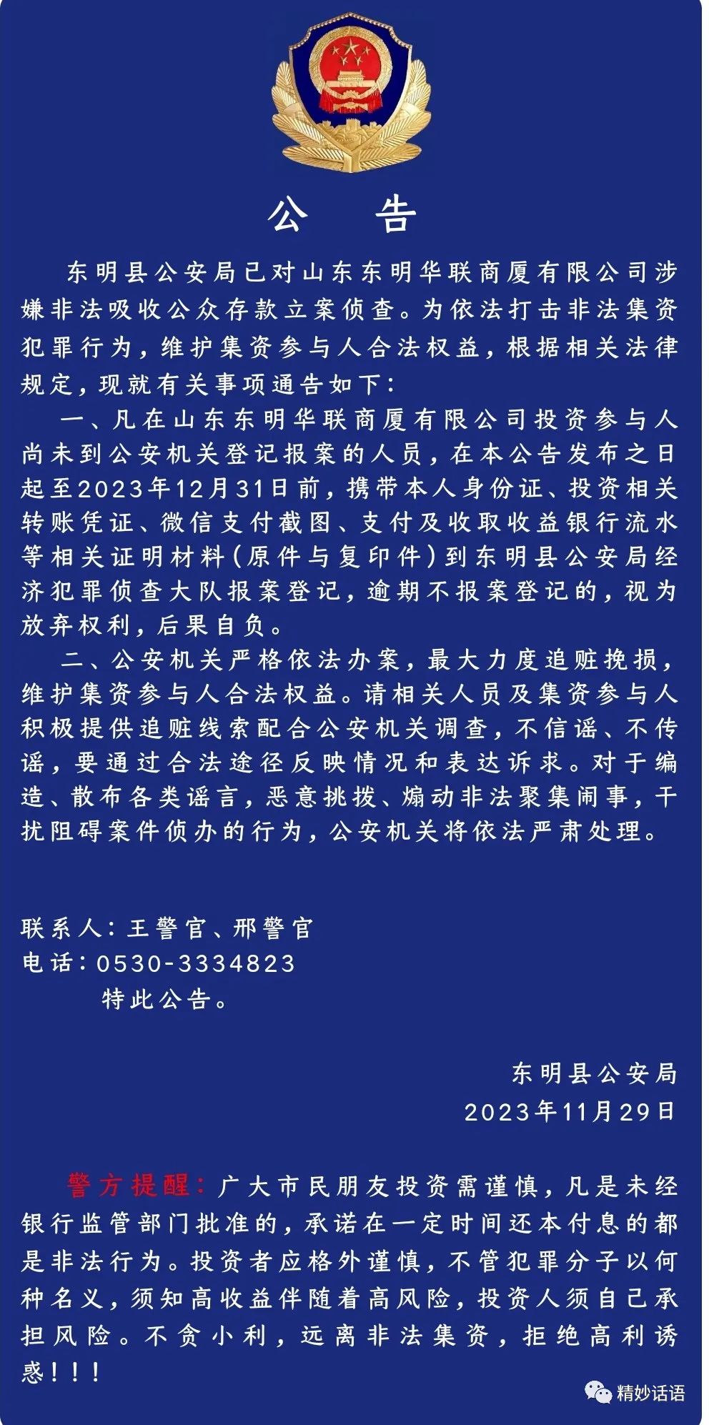 山东东明华联商厦有限公司涉嫌非吸案最新通告来啦,参与人速去报案登记……