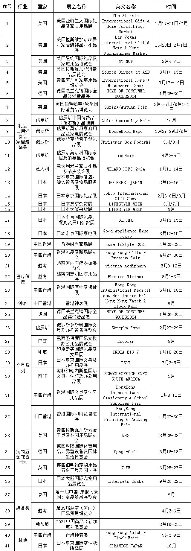 为持续帮扶企业开拓海外市场,现将收集到的2024年境外展会信息(第一期)提供给各有关企业,请各企业自行查阅,视实际情况积极赴外参展。如有意参展请及时联系组展单位(电话附后)。已确定参展的企业,请同步向县工信商务局报备(联系电话:87382436),并将参加展会名称、时间等信息发送至邮箱shangwuju2015@163.com,以便落实相关政策兑现工作。