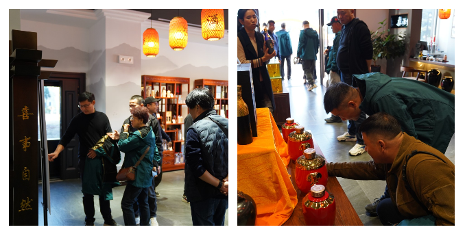在酿酒车间,客人们深入了解了江西婺酒酒业的酿造工艺和独特文化。他们亲自观摩了酒的酿造过程,对婺酒的原料选择、发酵过程、清酱特香特点以及陶坛储存等各个环节都有了深入的了解。