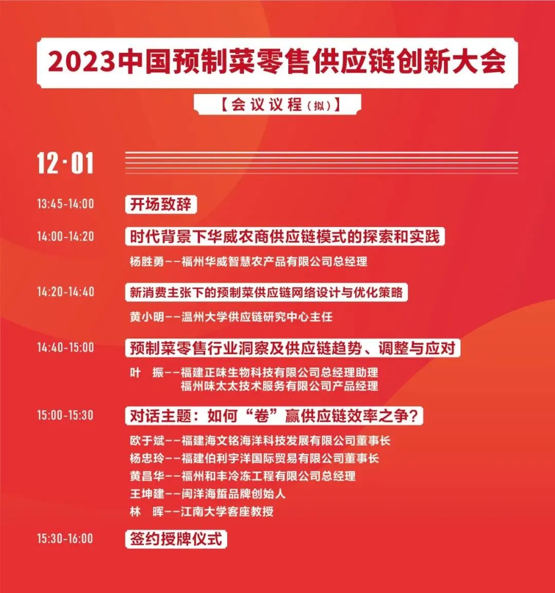 “2023中国预制菜零售供应链创新大会”作为第4届中国预制菜企业家峰会的重要组成部分,将汇聚国内外大型生鲜电商平台、综合性零售企业、餐饮食材供应商等知名企业,以全面优化预制菜产业新商业模式为落脚点,通过多元话题研究、问答交流,建立健全高效预制菜供应链体系,积极探索预制菜产业发展新趋势。