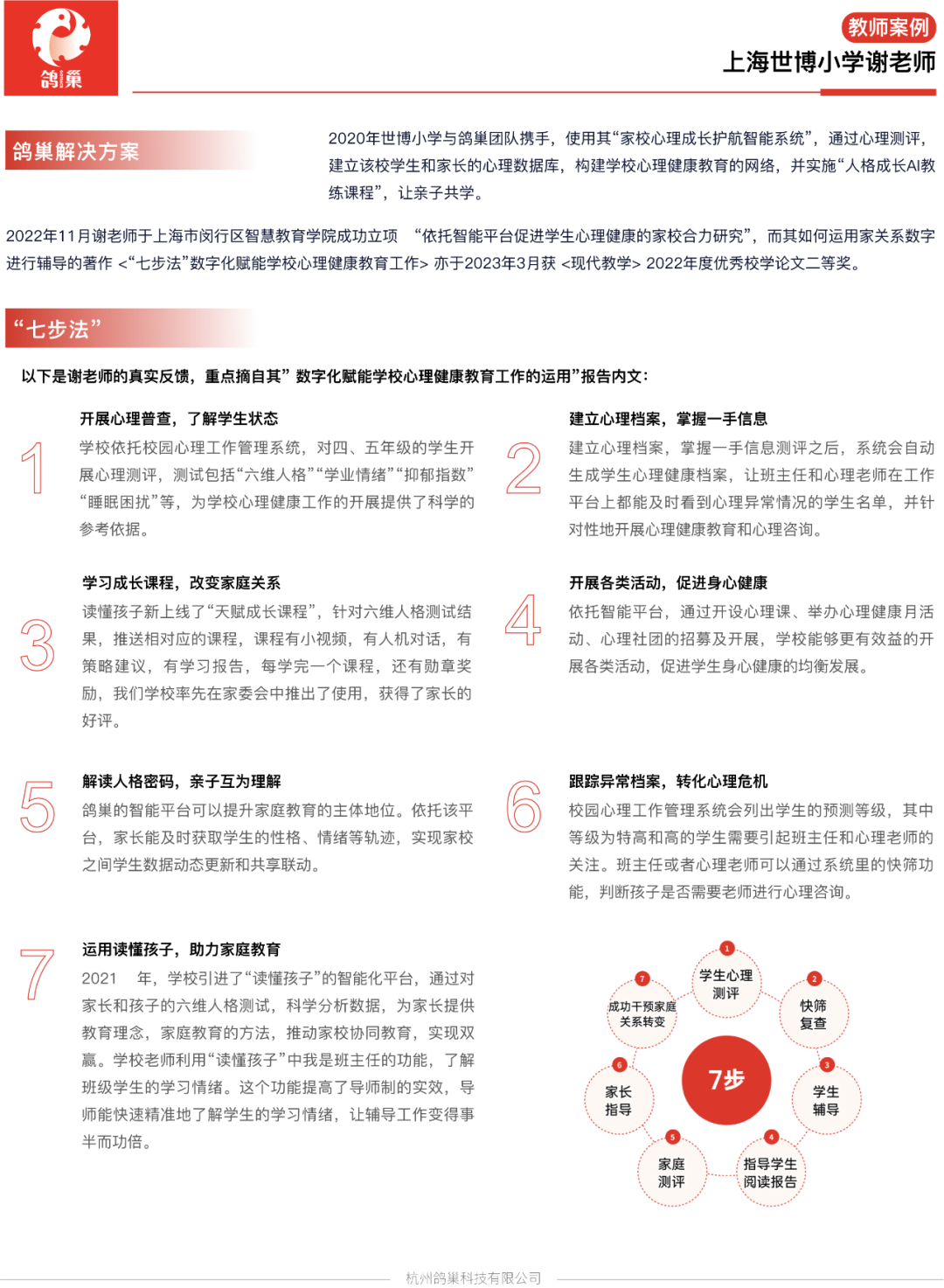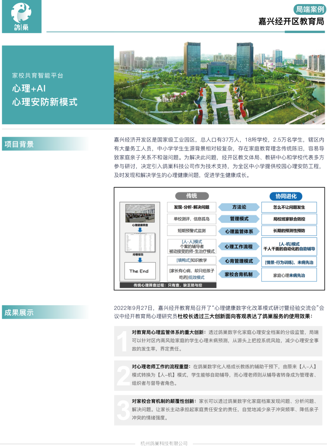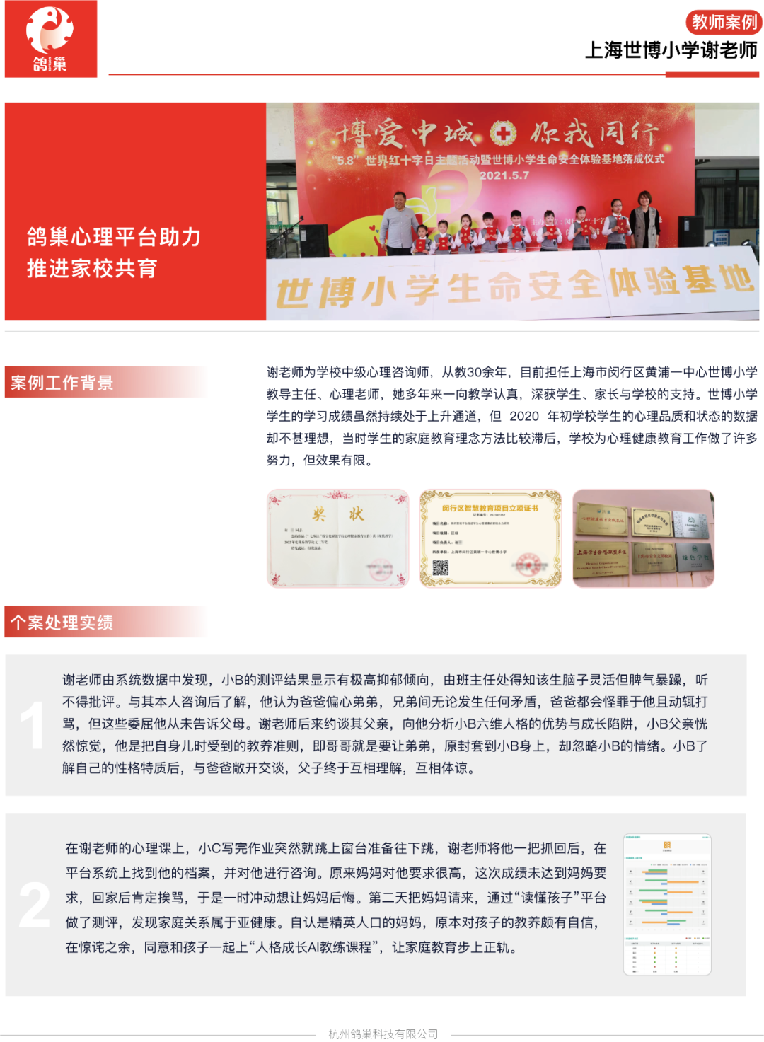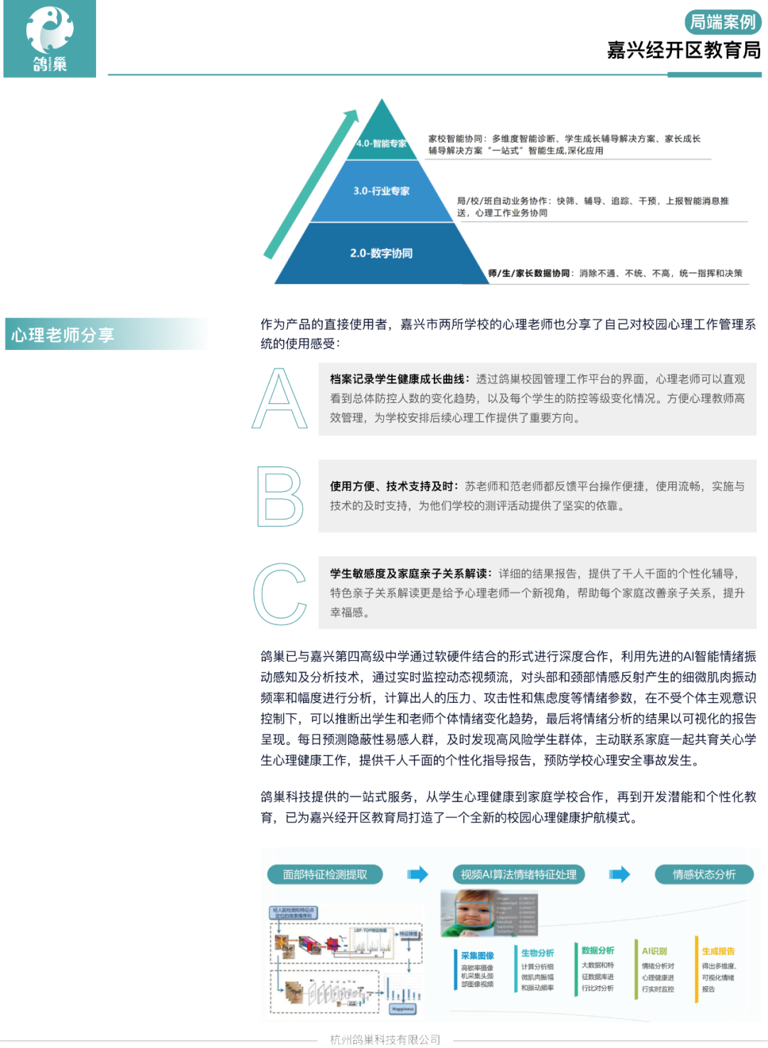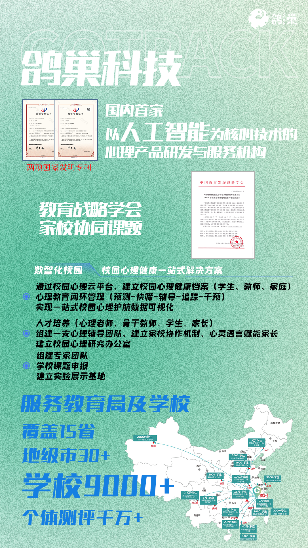 鸽巢的心理数智化解决方案,通过预测预警的算法能力,智能生成预测名单与预警名单,提前锁定隐蔽性群体,提前预防;多维度、多角色的测评体系,建立局校班家联合防控机制;AIEQ动态及静态监测技术,通过科学的仪器获取客观的心理报告,让家长配合学校采取行动;亲子兼容度心理模型,帮助家校达成共识,提供千人千面的个性化教养策略;学校心理档案全流程记录,界定家校责任。鸽巢独有的人格专利技术研发的人格成长Ai教练,让家长读懂孩子,获取千人千面的教养策略,开发孩子天赋潜能,使亲子关系实现良性循环,建立线上数字化心理方舱医院,实现普惠化大规模的未病先治,从家庭端建立校园心理健康长效机制。