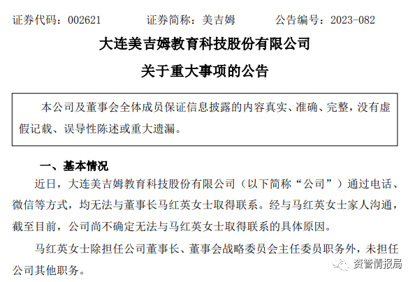 11月29日晚,*ST天山、美吉姆两家A股上市公司双双公告,无法与公司董事长取得联系,且不确定无法取得联系的具体原因。