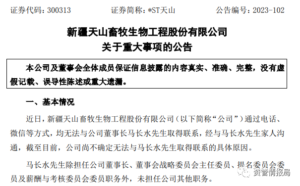 11月29日,*ST天山公告,近日,公司通过电话、微信等方式,均无法与公司董事长马长水取得联系,经与马长水家人沟通,截至目前,