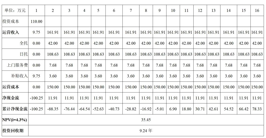 社区养老服务机构的单位床位投资成本为6-12万元之间。投资成本=建筑工程费用+设备购买费用+安装及材料费用+其他费用=单位床位成本(10万元/个)*床位数=10*11=110万元
