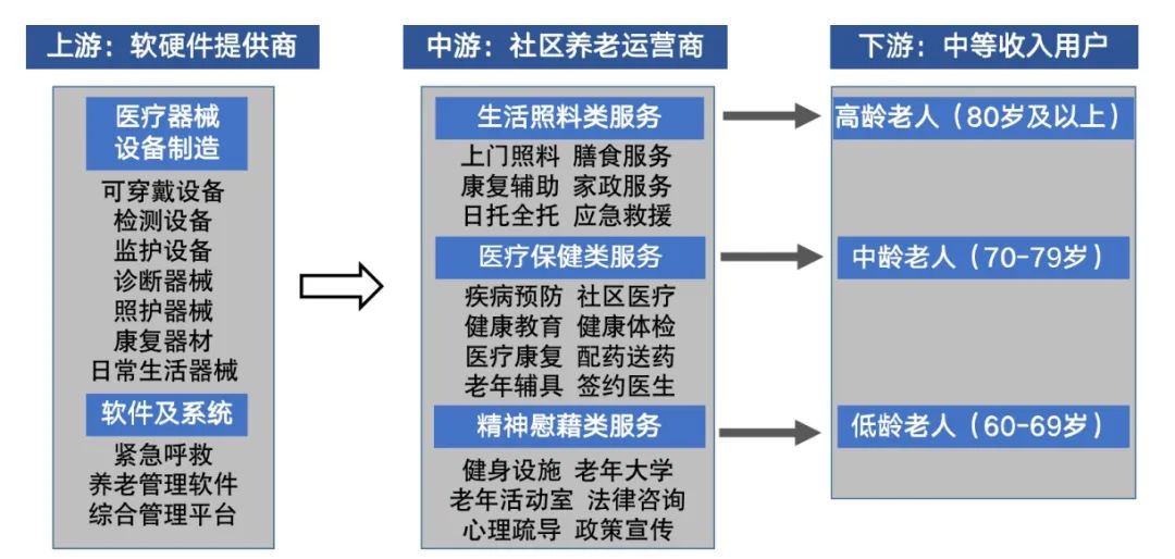 社区养老的上游是软硬件提供商,为养老服务提供相关医疗器械器材、软件及系统等。中游为社区养老运营商,主要提供生活照料类服务、医疗保健类服务、精神慰藉类服务;下游则是中等收入群用户。其中上游行业集中度较低,尤其是医疗器械设备,前瞻产业研究院统计:2021年我国医疗器械的CR10仅超过10%;不过获利能力相对较好,平均净利率高于18%,超半数的企业高于18%,目前呈现出医疗器械设备供应商转型社区养老运营服务商的趋势,如淮景医疗。中游目前处于发展初期,地域特征强,竞争格局分散,尚未出现头部企业,商业模式有待探索。