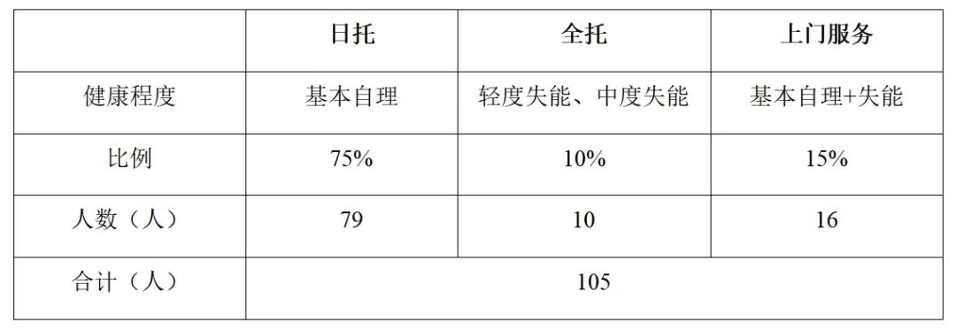 本文模拟南京市的一家综合型社区养老服务机构建设项目。该机构总建筑面积600平方米;辐射范围内共有750户人家,假设每户有2名老人有社区养老需求,按照“9073”的格局,约有105位老人有社区养老需求,其中75%的老人日托,10%的老人需要全托,15%的老人上门服务,如下表所示: