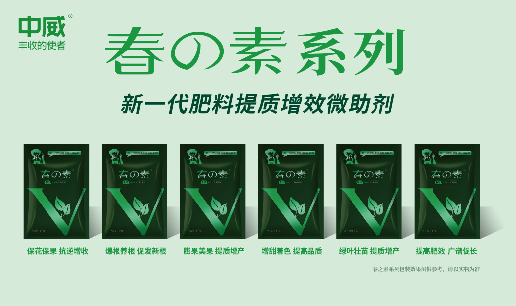 中威携新一代肥料提质增微助剂春の素系列,多多收、春雨一号、中威丰雨、子弹头等绿色健康的植物营养品,旨在发掘作物潜能、平衡营养,增强作物抵抗力、免疫力,让植物健壮生长,同时提高药、肥利用率,少用肥、少用药,改善作物品质、增产丰收。