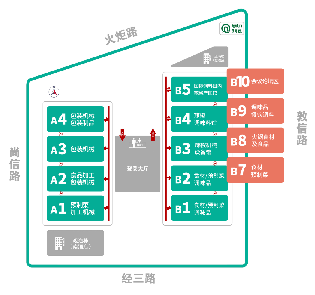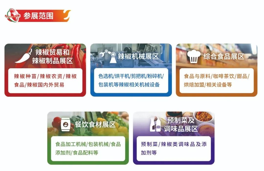 展区设置:辣椒贸易和辣椒制品展区;辣椒机械展区;德州味展区;综合食品展区;餐饮食材展区;食品添加剂、配料展及调味品展区;食品加工包装技术展区。