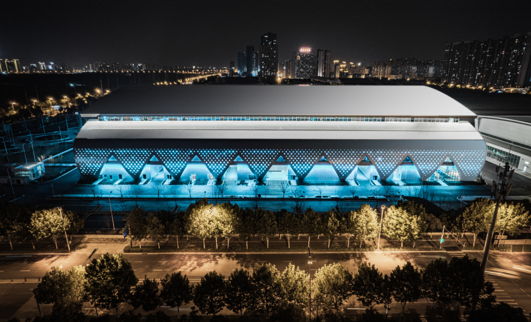 合肥滨湖国际会展中心二期项目最具亮点特色的是2号综合展馆,为国内同类建筑最大跨度展馆,展馆由10榀跨度144米的张弦桁架及屋面支撑体系组成,采用的直径218毫米的半平行PE拉索是国内民用建筑最大直径拉索。从高空俯瞰,整个综合馆钢结构屋面如同一副巨大的“弯弓”,气势恢宏。