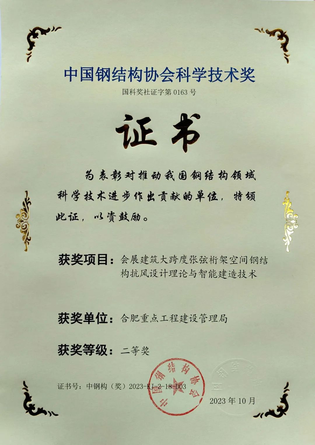 近日,由合肥市重点工程建设管理局建设的合肥滨湖国际会展中心二期项目,荣获中国钢结构协会科学技术二等奖。中国钢结构协会科学技术奖(国科奖社证字第0163号),每年评审一次,是中国钢结构协会最具影响力、业内关注度最高的奖项之一。