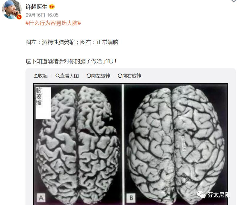 大家一定要引以为戒啊!许多研究表明,每天只喝一小杯酒,脑子就会比不喝酒的人衰老快半年。更可怕的是,每天三四杯的量,脑子就会比实际年龄老5年!长此以往,脑细胞死亡速度加快,海马体、杏仁核等部位都会萎缩。