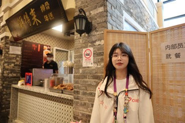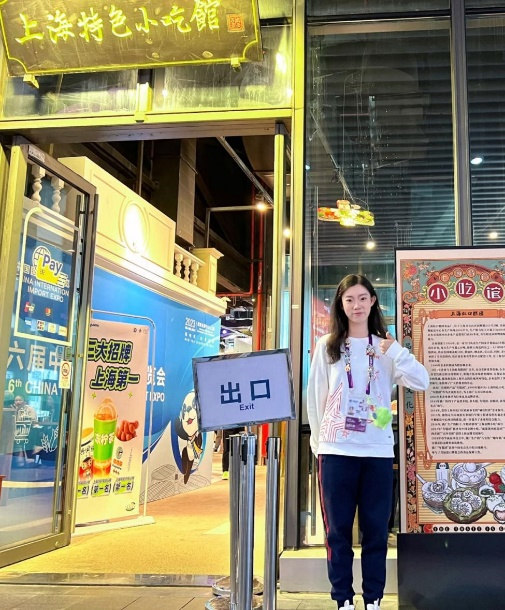哈喽大家好,我是广告221班的罗园媛,很荣幸成为第六届进口博览会小叶子的一员。这次作为上海特色小吃馆的小叶子,我的工作是负责解答顾客的疑问以及现场引导。上海特色小吃馆就在一楼中心广场上海馆的背后,中午的客流量特别大,我也度过了非常充实的一周,收获了友谊与难忘的回忆。我们明年见啊。