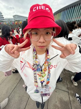 Hello~大家好,我是来自广告222班的包沈怡,很高兴成为第六届进博会小叶子的一员。在本届进博会中,我的岗位是餐饮食品供应保障组特色小吃馆服务志愿者,主要工作内容为在小吃馆现场引导人流、维持秩序等。很荣幸能和大家一起在这重大国际展会的志愿服务之中出力,为祖国增光,为城市添彩。
