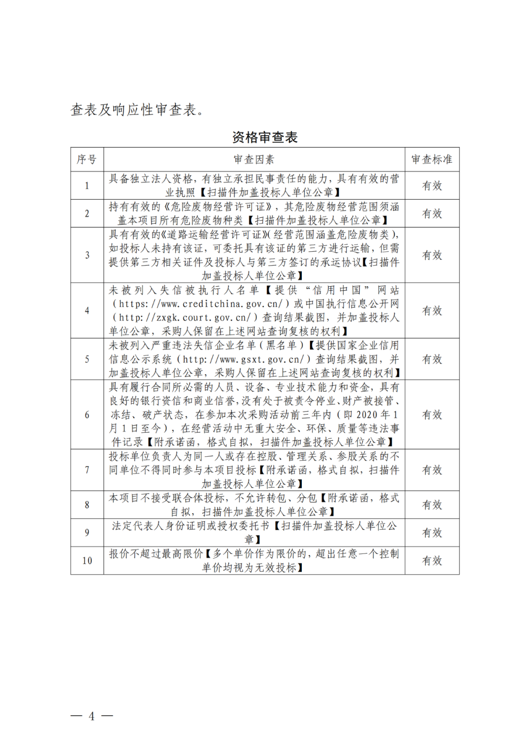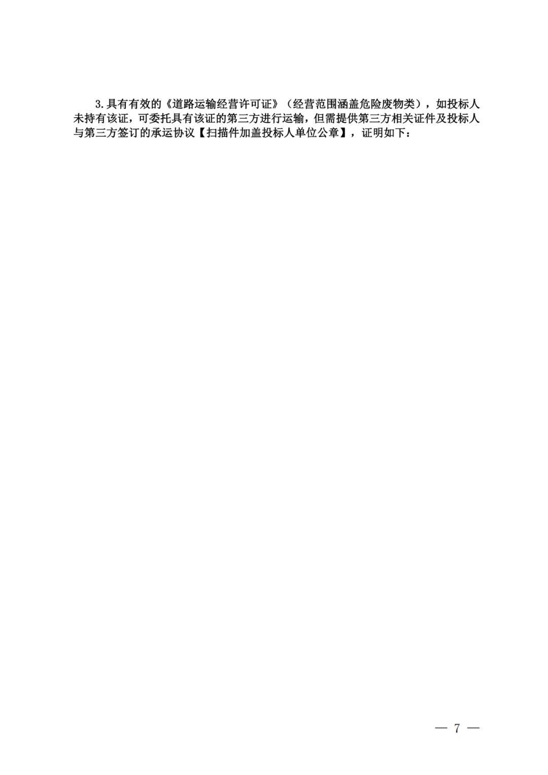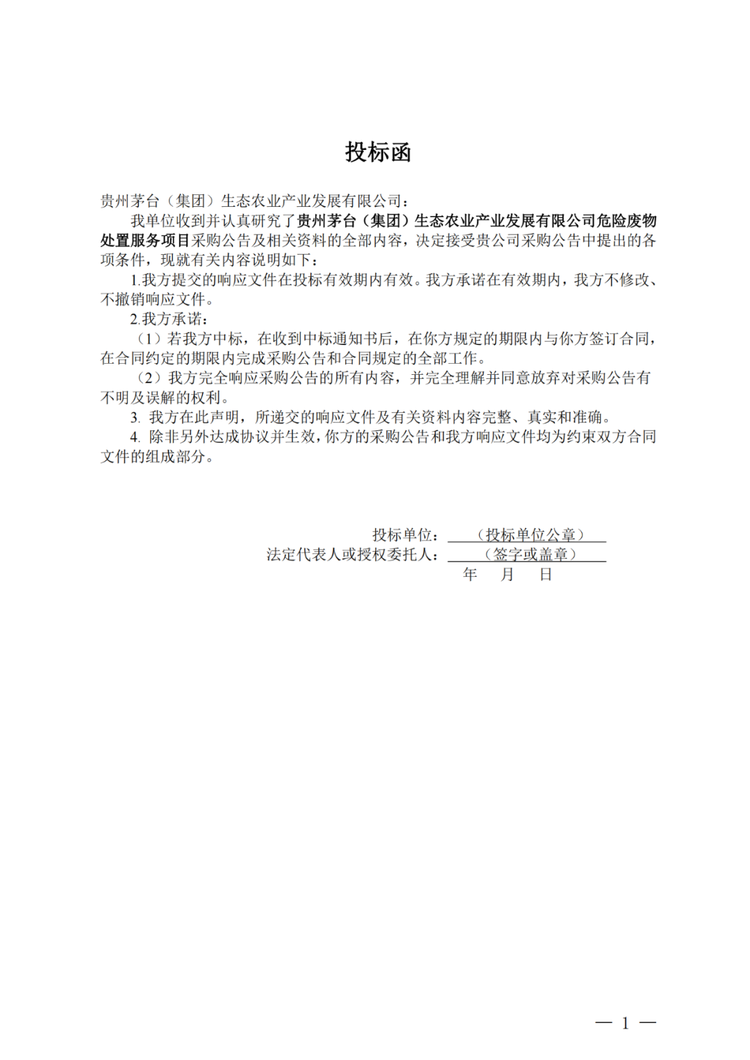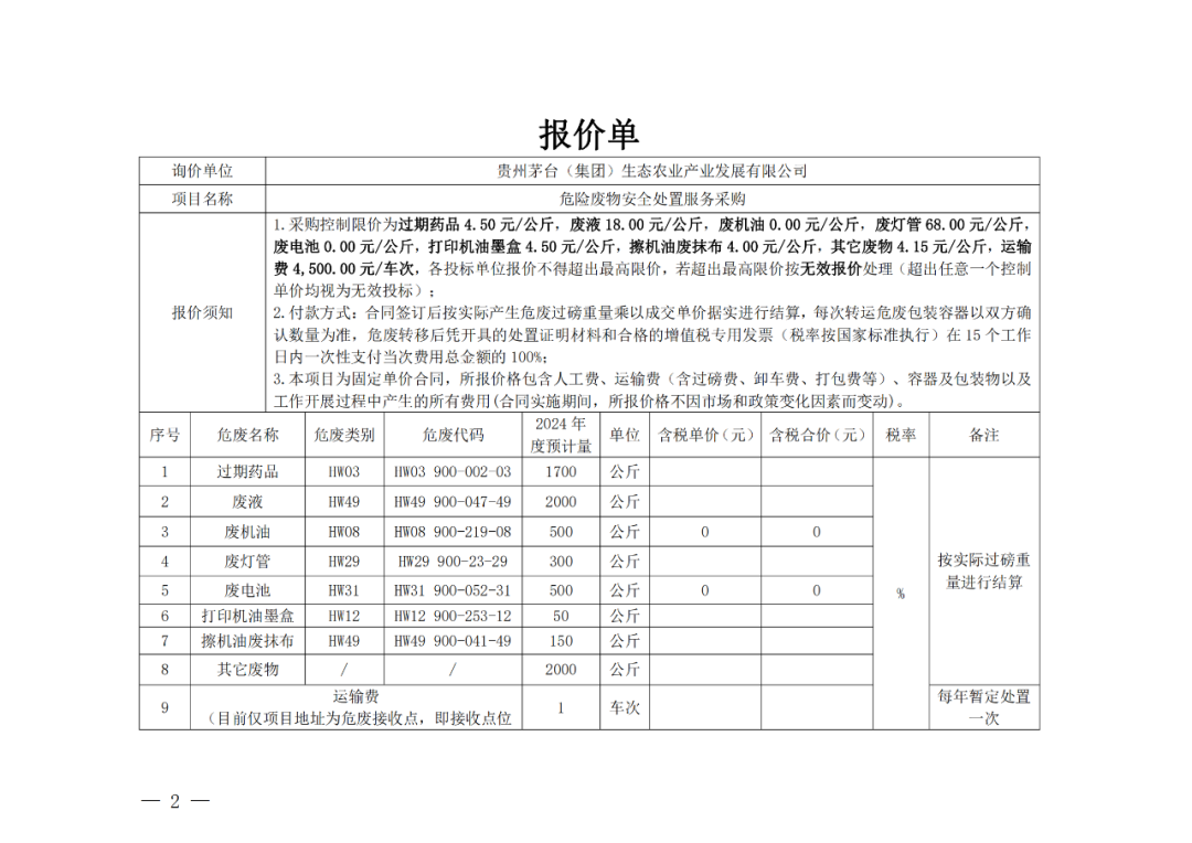 为防治危险废物污染环境,维护生态环境,确保危险废物通过合法、合规的处置,根据国家有关法律法规和我司相关管理制度,我司拟对危险废物处置服务项目进行公开询比价,现邀请符合条件的单位参与比价,投标要求如下:贵州省丹寨县金钟经济开发区锦绣路茅台生态农业园区。1.具备独立法人资格,有独立承担民事责任的能力,具有有效的营业执照【扫描件加盖投标人单位公章】;2.持有有效的《危险废物经营许可证》,其危险废物经营范围须涵盖本项目所有危险废物种类【扫描件加盖投标人单位公章】;3.具有有效的《道路运输经营许可证》(经营范围涵盖危险废物类),如投标人未持有该证,可委托具有该证的第三方进行运输,但需提供第三方相关证件及投标人与第三方签订的承运协议【扫描件加盖投标人单位公章】;4.未被列入失信被执行人名单【提供“信用中国”网站(https://www.creditchina.gov.cn/)或中国执行信息公开网(http://zxgk.court.gov.cn/)查询结果截图,并加盖投标人单位公章,采购人保留在上述网站查询复核的权利】;5.未被列入严重违法失信企业名单(黑名单)【提供国家企业信用信息公示系统(http://www.gsxt.gov.cn/)查询结果截图,并加盖投标人单位公章,采购人保留在上述网站查询复核的权利】;6.具有履行合同所必需的人员、设备、专业技术能力和资金,具有良好的银行资信和商业信誉,没有处于被责令停业、财产被接管、冻结、破产状态,在参加本次采购活动前三年内(即2020年1月1日至今),在经营活动中无重大安全、环保、质量等违法事件记录【附承诺函,格式自拟,扫描件加盖投标人单位公章】;7.投标单位负责人为同一人或存在控股、管理关系、参股关系的不同单位不得同时参与本项目投标【附承诺函,格式自拟,扫描件加盖投标人单位公章】;8.本项目不接受联合体投标,不允许转包、分包【附承诺函,格式自拟,扫描件加盖投标人单位公章】;贵州茅台(集团)生态农业产业发展有限公司生产经营过程中将会产生系列危险废物,根据环保相关要求需对所产生的危险废物进行合法化处置,危险废物主要包含实验室废液、废机油、废电池、废灯管、过期药品、擦机油废抹布及打印机油墨盒等,现需委托第三方具备资质的单位对危险废物进行安全处置。对贵州茅台(集团)生态农业产业发展有限公司(以下简称“采购人”)2024至2026年度不定期产生的危险废物进行不定期转移、贮存、处置,协助完成危险废物台账建立,以保障危废处置符合国家环境保护相关法律法规要求。危险废物包括但不限于HW03、HW08、HW12、HW29、HW31、HW49等其他废物,具体详见报价单。原则上为三年,合同一年一签一考核,价格一年一议,服务期的起止时间以合同签订生效时间为准,续签合同须经采购人根据合同期内供应商履约情况综合考核评估,若考核不合格的,采购人将有权拒绝与其续签下一年度合同。1.投标人必须严格遵守《中华人民共和国环境保护法》、《中华人民共和国固体废物污染环境防治法》《危险废物经营许可证管理办法》等国家相关法律法规规定的要求转移、贮存、处置采购人的危险废物;2.采购人将其生产经营过程中产生的危险废物进行收集与分类,安全堆码暂存在符合规范的厂区设施内,并在各类危险废物包装桶、容器上张贴危险废物标识标签,标明包装物上沾染的或包装桶、容器中含有的危险废物名称、成分(液态危废的收集、暂存、转运的桶装容器由投标人免费提供);3.对于采购人标明的品名、成分等涉及采购人商业秘密的内容,投标人工作人员必须严格保密;4.投标人应在接到采购人通知后5个工作日内,自行组织车辆到采购人指定地点将危险废物转移处置。采购人有义务为投标人装运工作提供相应的便利条件,同时投标人工作人员在采购人场所内应该遵守采购人管理制度;5.投标人所拟派的工作人员存在技术水平低、责任心差等不符合采购人条件时,采购人有权拒绝使用;6.投标人需与采购人核实运输、贮存和处置危险废物种类及数量,交接危险废物时,双方需在移交单据上签字确认,投标人需按生态环境部门要求及时准确填写危险废物转运联单,当危险废物平台出现异常时,投标人应积极协调与配合生态环境部门的相关要求,解决系统异常等问题;7.投标人需确保各项运输、贮存、处置条件和设施符合国家法律、法规对危险废物运输、贮存、处置的技术要求,确保在运输、贮存、处置过程中不产生对环境的二次污染,如投标人未能按照国家法律、法规运输、贮存、处置危险废物的,投标人需承担由此产生的法律责任、经济赔偿;8.投标人将危险废物运出采购人指定地点后,运输、贮存及处置过程中的风险责任均由投标人全部承担(若有第三方责任也由投标人自行追责),与采购人无关;9.采购人有权随时监督检查投标人的处置是否符合相关法律法规要求,投标人在危险废物运输、贮存、处置过程中管理不善、操作不当导致采购人财产损失、人员伤亡或造成其它不良影响的,需履行对采购人的赔偿责任,承担采购人合理赔偿要求;10.针对有回收利用价值的危险废物,其回收价值由投标人在本项目处置报价中予以综合考虑,再生利用收益归投标人;11.投标人应在国家执法机关检查或采购人需要时,对于采购人交投标人处置的危险废物据实出具相应的处置证明;12.投标人须确保已依法制定