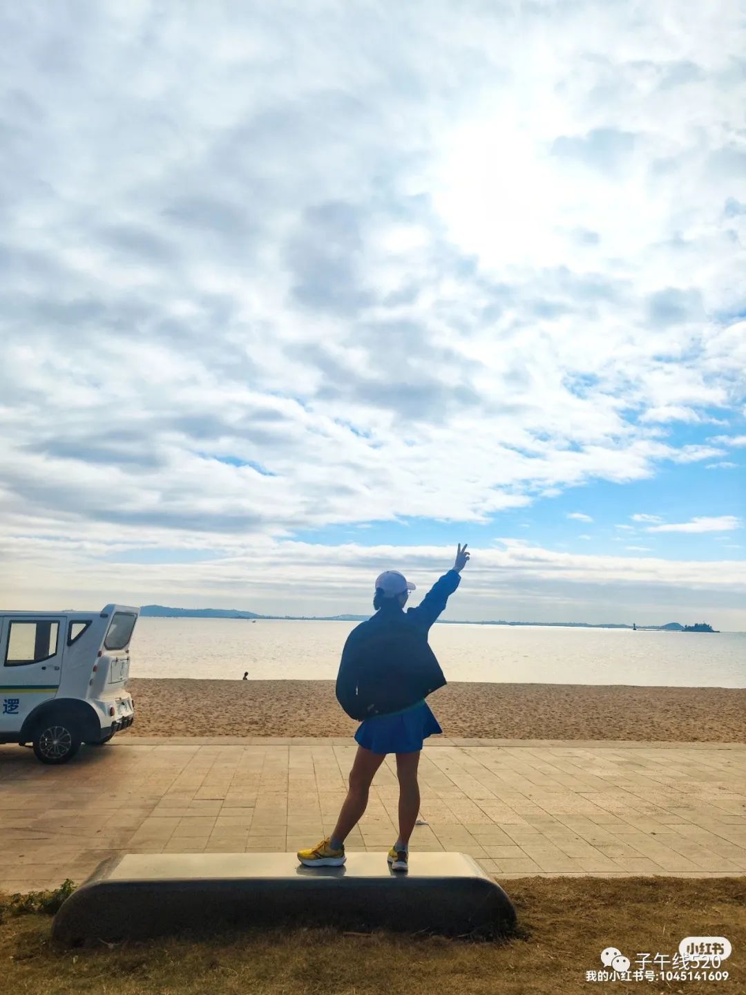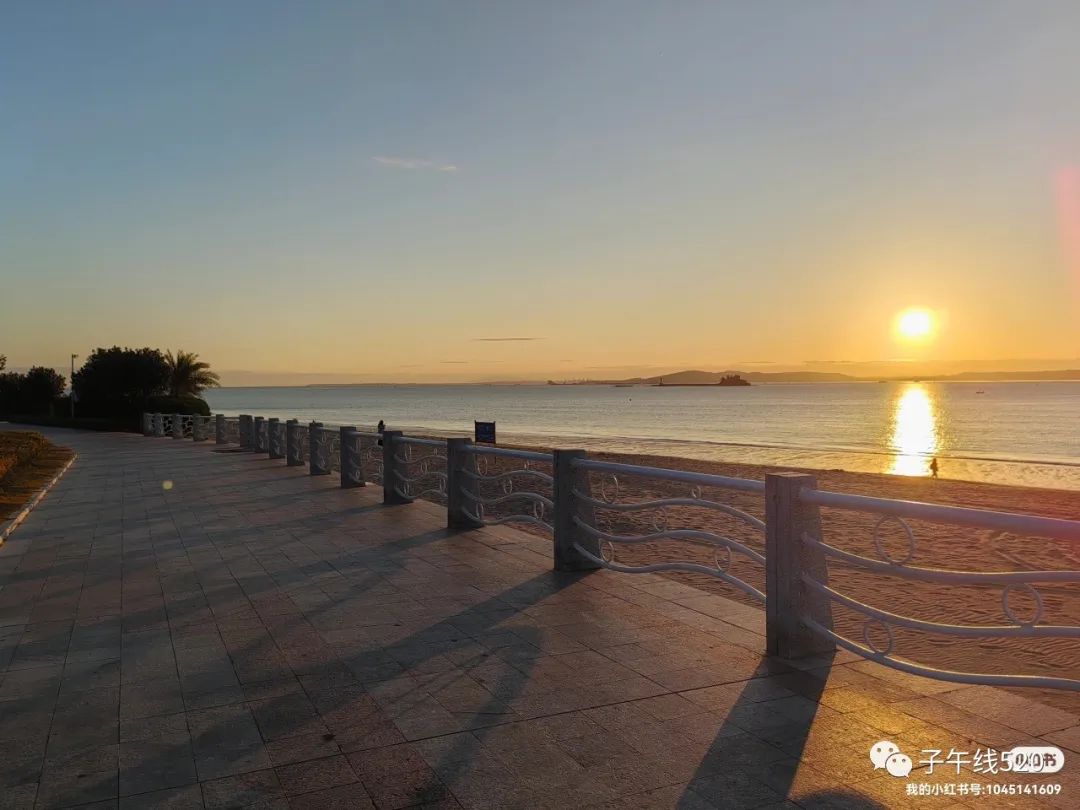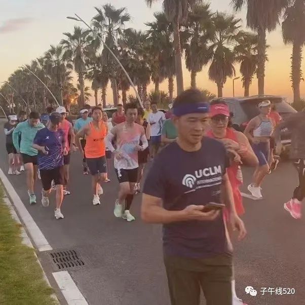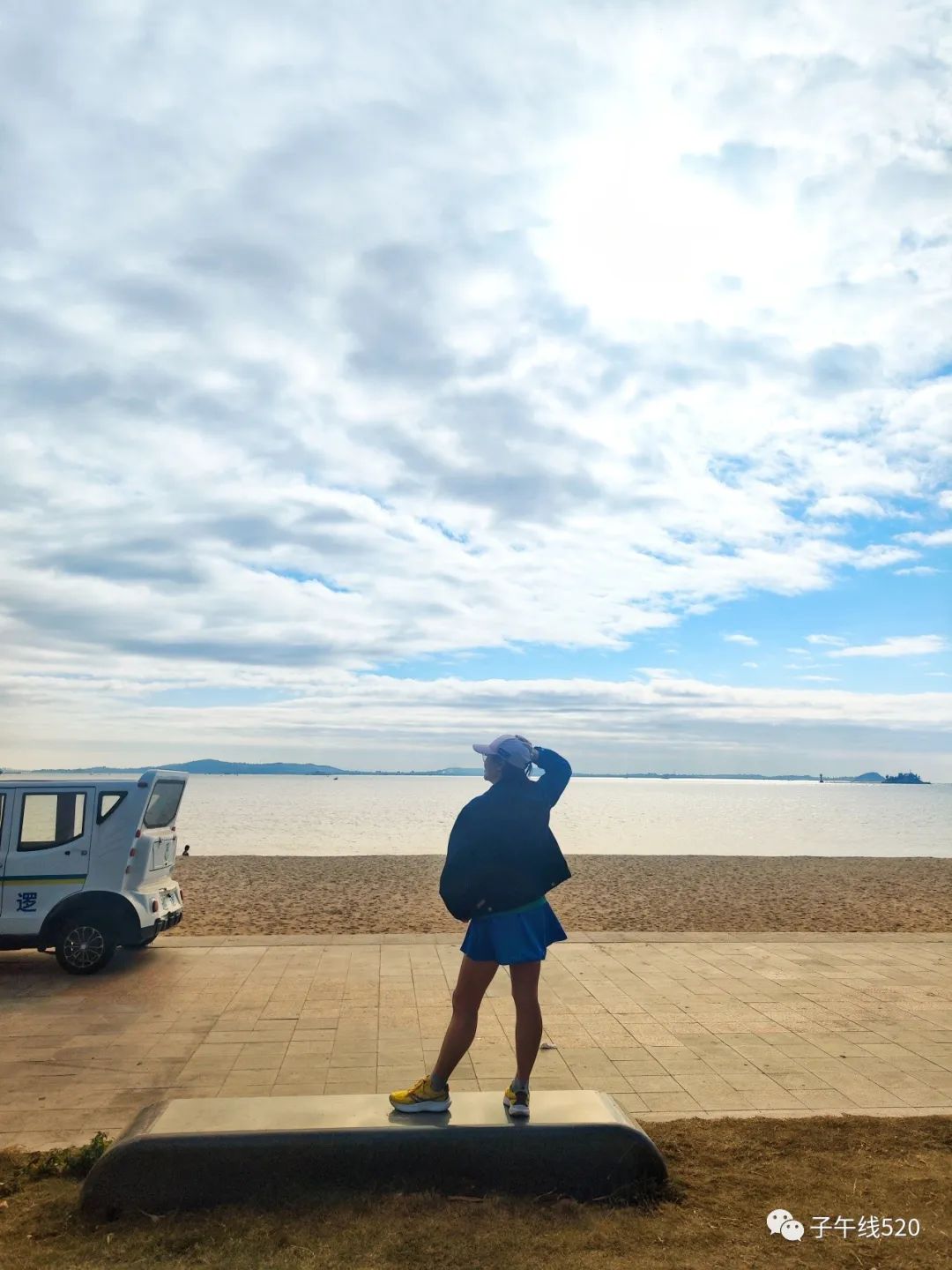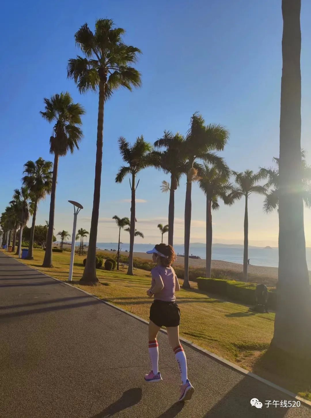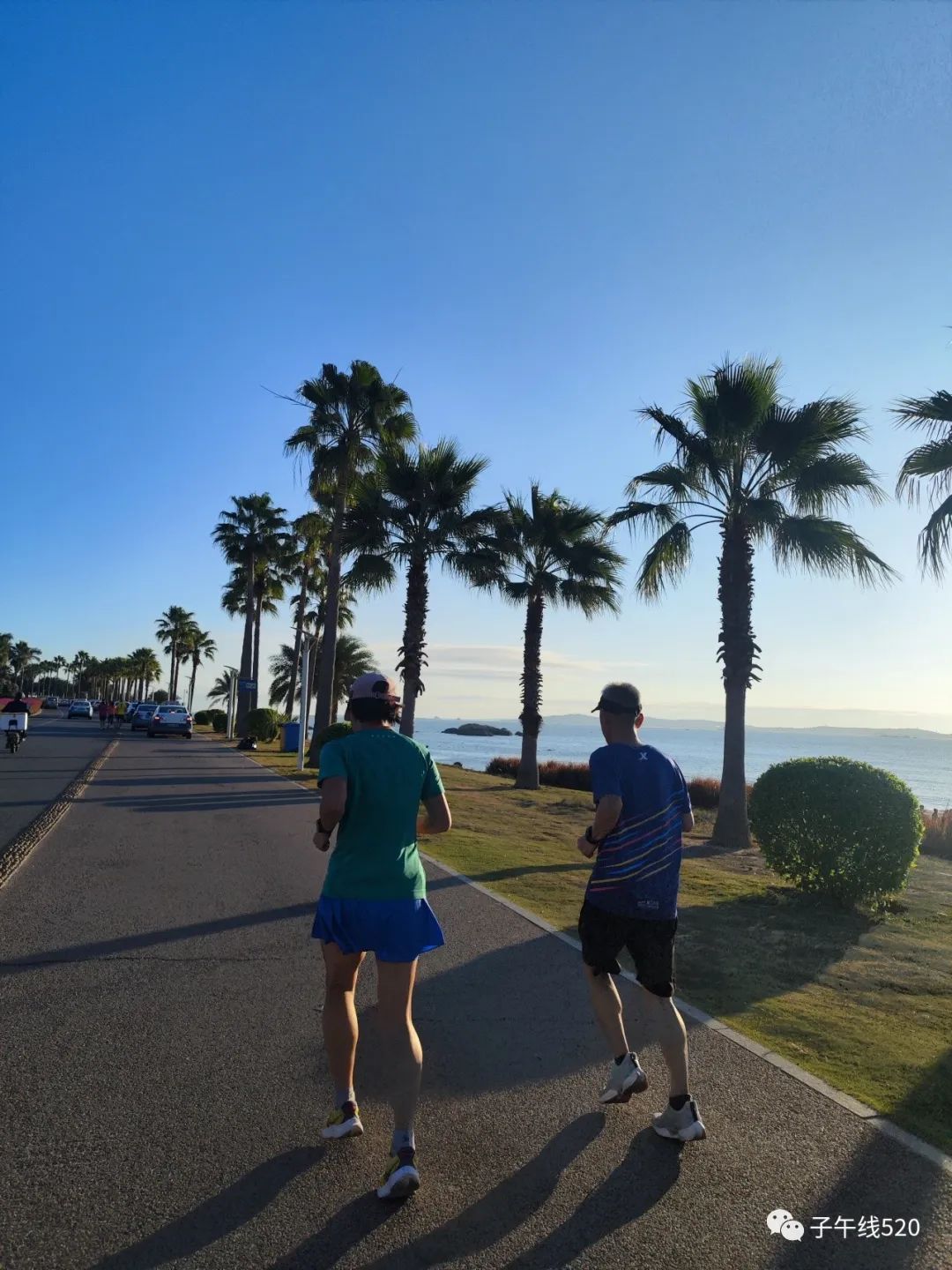 喝完水,我们又继续折返,起伏的跑道,美丽的海岸线,一路上沉醉在环岛路醉美的风景里,另一面的天空在太阳的映射下,呈现一片绚丽的温暖,我们每个人都披上了一道霞光,这时看日出的人群也开始从海滩上来了,环岛路熙熙裹裹。