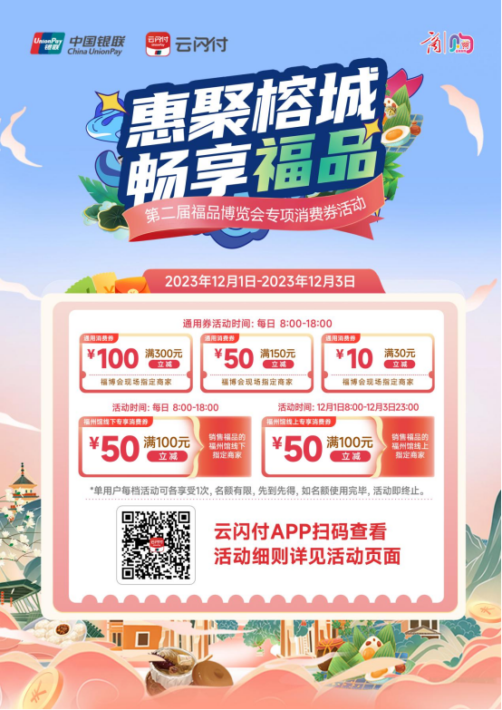 充分满足市民朋友多层次、多样化、个性化的消费需求。活动期间市民朋友无需领券,在指定商家使用云闪付APP支付立享满减优惠,活动总名额有限,先到先得,用完即止。市民可登陆云闪付APP“数智云商”平台查看活动商家和剩余名额等活动详情,欢迎广大市民朋友积极参与体验。本届福品博览会将有力推进“福文化”“福品”全球范围内进一步传播推广。在此基础上,随着“元旦春节”等传统节假消费旺季的到来,以及各项优惠措施的出台,助力全面激发消费市场活力,助推经济高质量发展。本届福博会聚焦“福品卖全球,全球买闽货”、传播“福文化”等重点内容,积极构建1大综合平台联动N项活动。即打造一大综合展区,在“六福”的基础上策划打造“十福”展区,发挥展会平台优势,丰富福味飘香、福享食尚、福茶生活、福见商旅、福农优品、福贸名品、福潮国风、福运可漆、福家福居、福汽满满10大展区内容,营造“福消费”氛围。同时,以品类细分打造“第4届中国预制菜产业博览会、“中国(福建)国际烘焙休闲食品博览会”、“2023中国福建漆艺博览会”3 大专业子展。第二届福博会