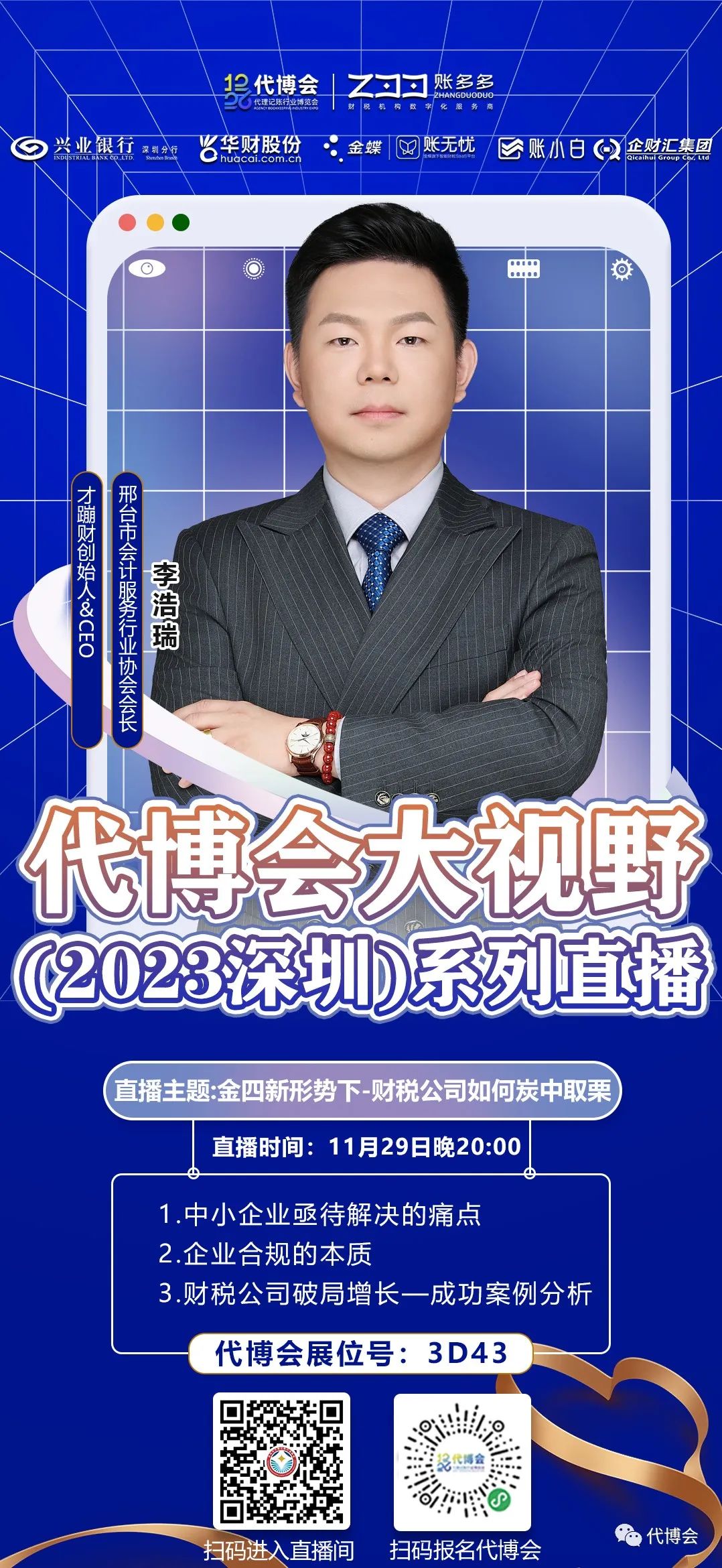 2023年11月29日晚上8点,本期为“1226代博会大视野”系列直播的第二十三期,特邀嘉宾为邢台市会计服务行业协会会长、才蹦财创始人&CEO李浩瑞,分享《金四新形势下-财税公司如何炭中取栗》。本期【深圳市代理记账行业协会】视频号近千人观看,感谢同行朋友一如既往的支持和收看。