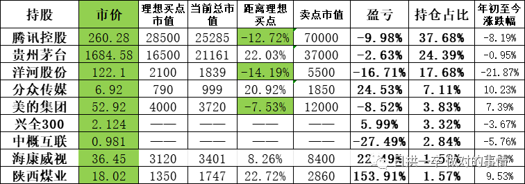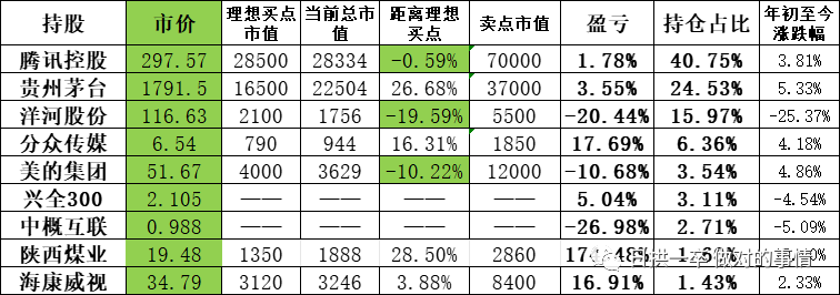 1.腾讯上涨较多,从买点之下-12.72%升到-0.59%了,茅台也小幅上涨。当前还在比较好的买点的是洋河和美的。美的商业模式一般,不会再加仓。当前剩余的资金最想用于茅台、其次是腾讯、最后是洋河。