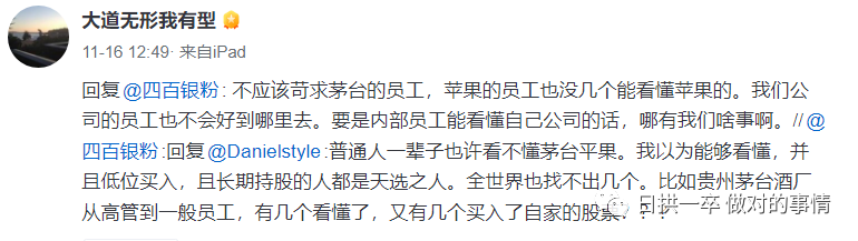 我觉得这些解析说服力都不够,起码不光明磊落。后来看大道的某次发言才理解,说到底就是茅台、苹果公司的人都不了解公司本身,如果他们都了解,就没有我们什么事了。果然还是大道理解透彻。