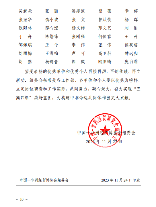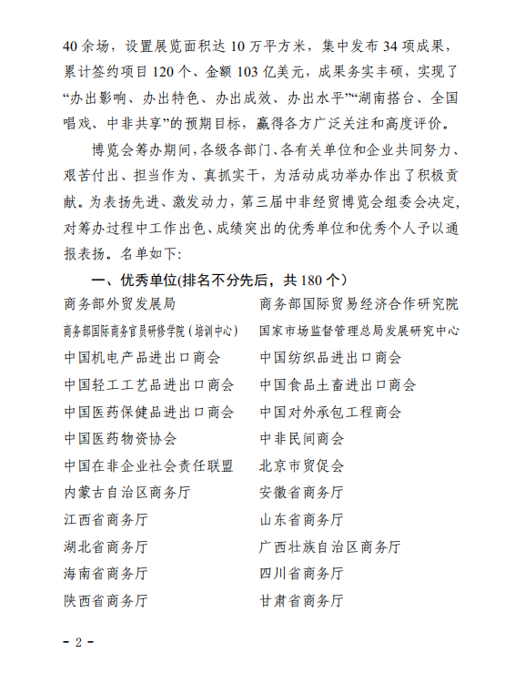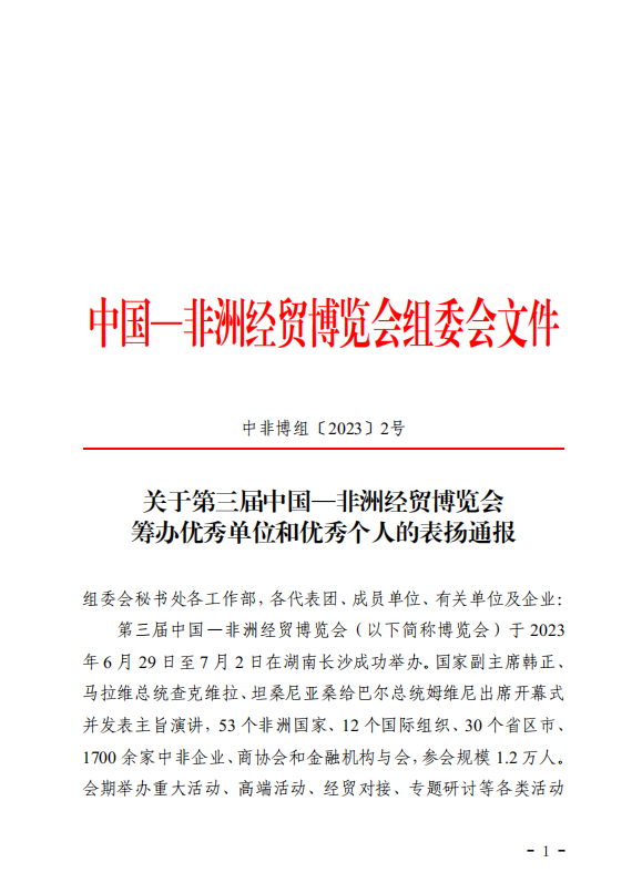 近日,中国—非洲经贸博览会组委会印发了第三届中非经贸博览会筹办优秀单位和优秀个人的表扬通报,协会荣获“优秀单位”,协会秘书长刘浦获评“优秀个人”。