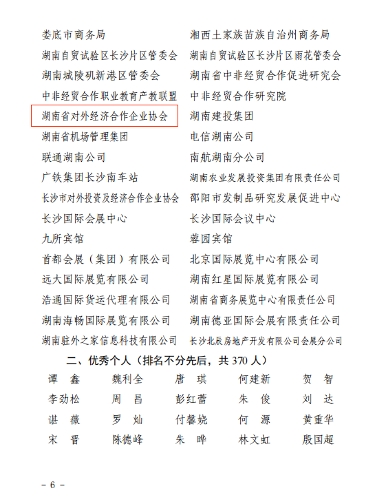 第三届中非经贸博览会期间,协会共组织65家单位300余人参会参展,组织我省重点“走出去”企业共同打造“湖南企业‘走出去’联盟”展览区域,吸引众多企业驻足参观,获得社会各界广泛关注。参会单位包括金融机构、商协会、高校、央企、国企等不同类型单位,展示行业企业国际合作成果和影响,深化对非合作,形成了博览会和企业品牌价值及影响力扩大的双赢局面。其中执行秘书长黄艳尽职尽责、辛勤工作,展现出良好的精神风貌、扎实的工作作风和过硬的能力素质,得到中国—非洲经贸博览会组委会的来信感谢。