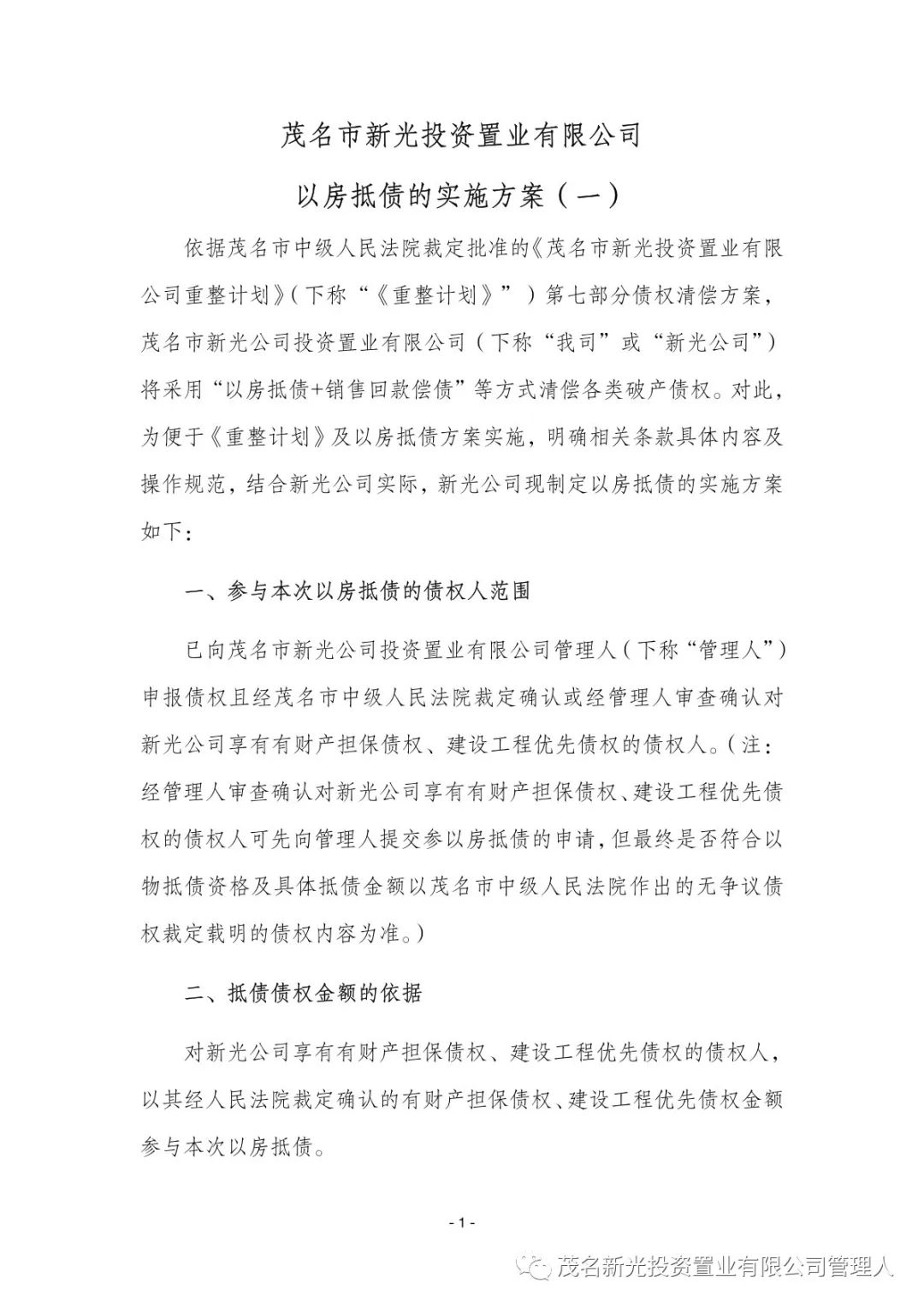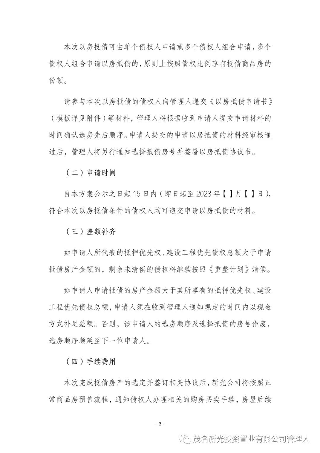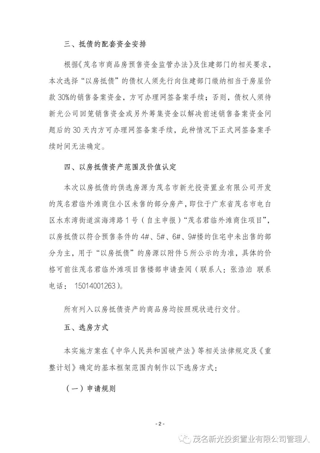关于茂名市新光投资置业有限公司(下称“新光公司”)破产重整一案,新光公司于2023年11月30日根据《茂名市新光投资置业有限公司重整计划》之有关规定,向管理人提交了《茂名市新光投资置业有限公司以房抵债的实施方案(一)》(下称“《以房抵债的实施方案(一)》”)。现管理人对《以房抵债的实施方案(一)》(附件)予以公示。