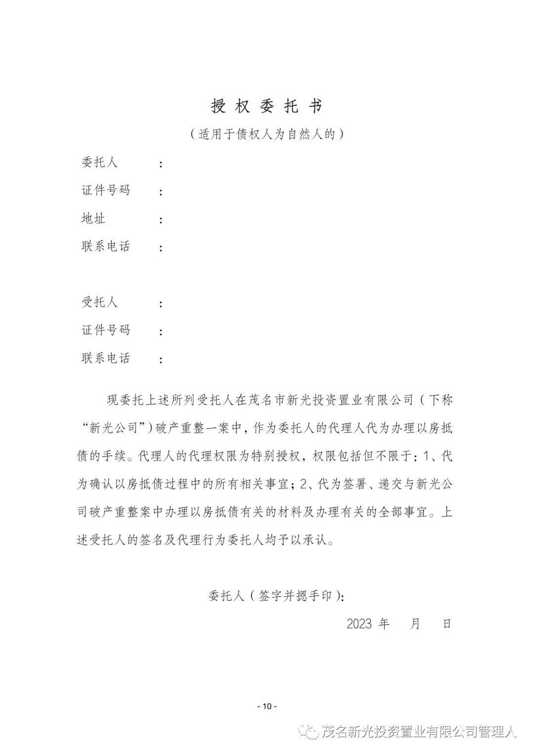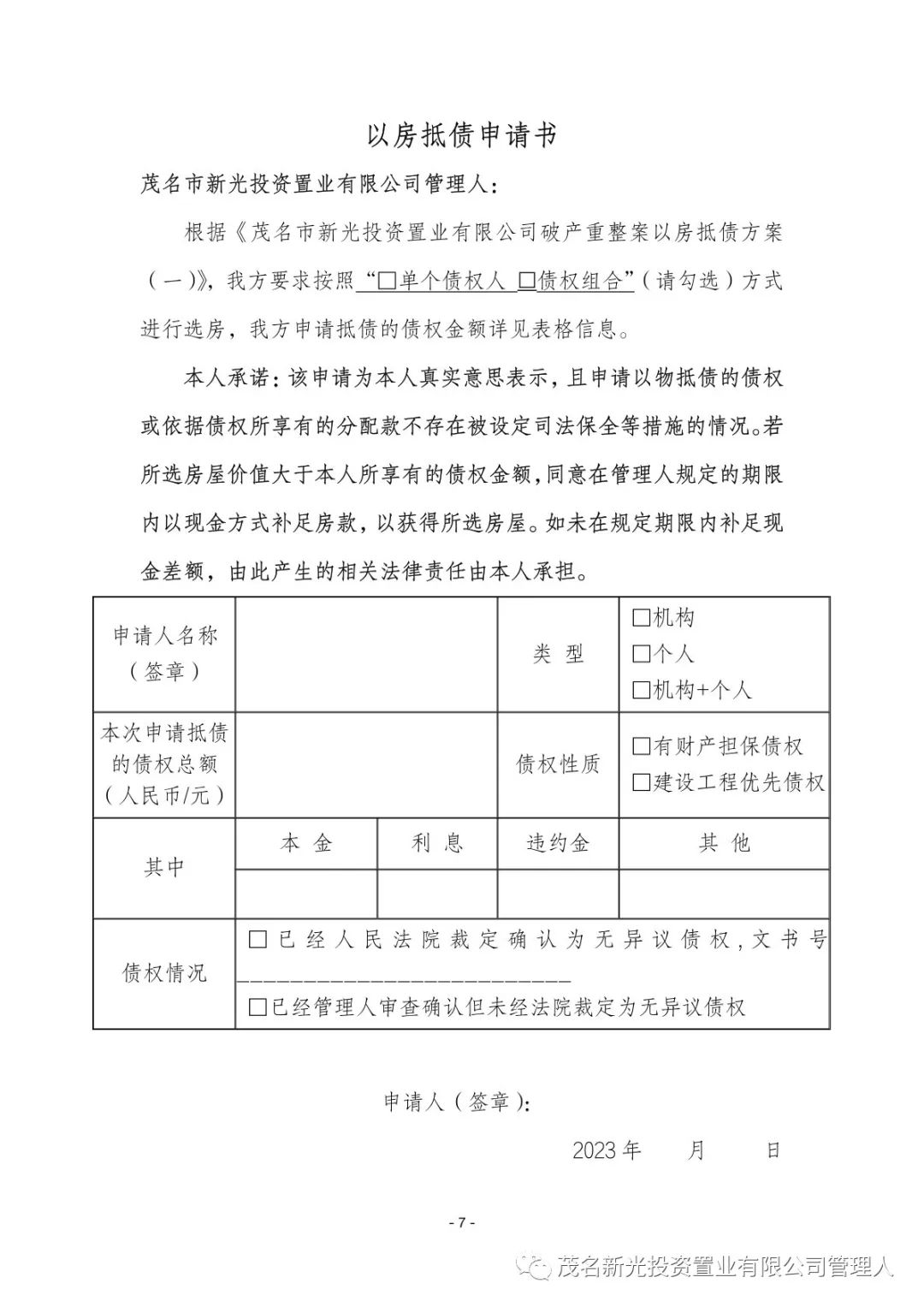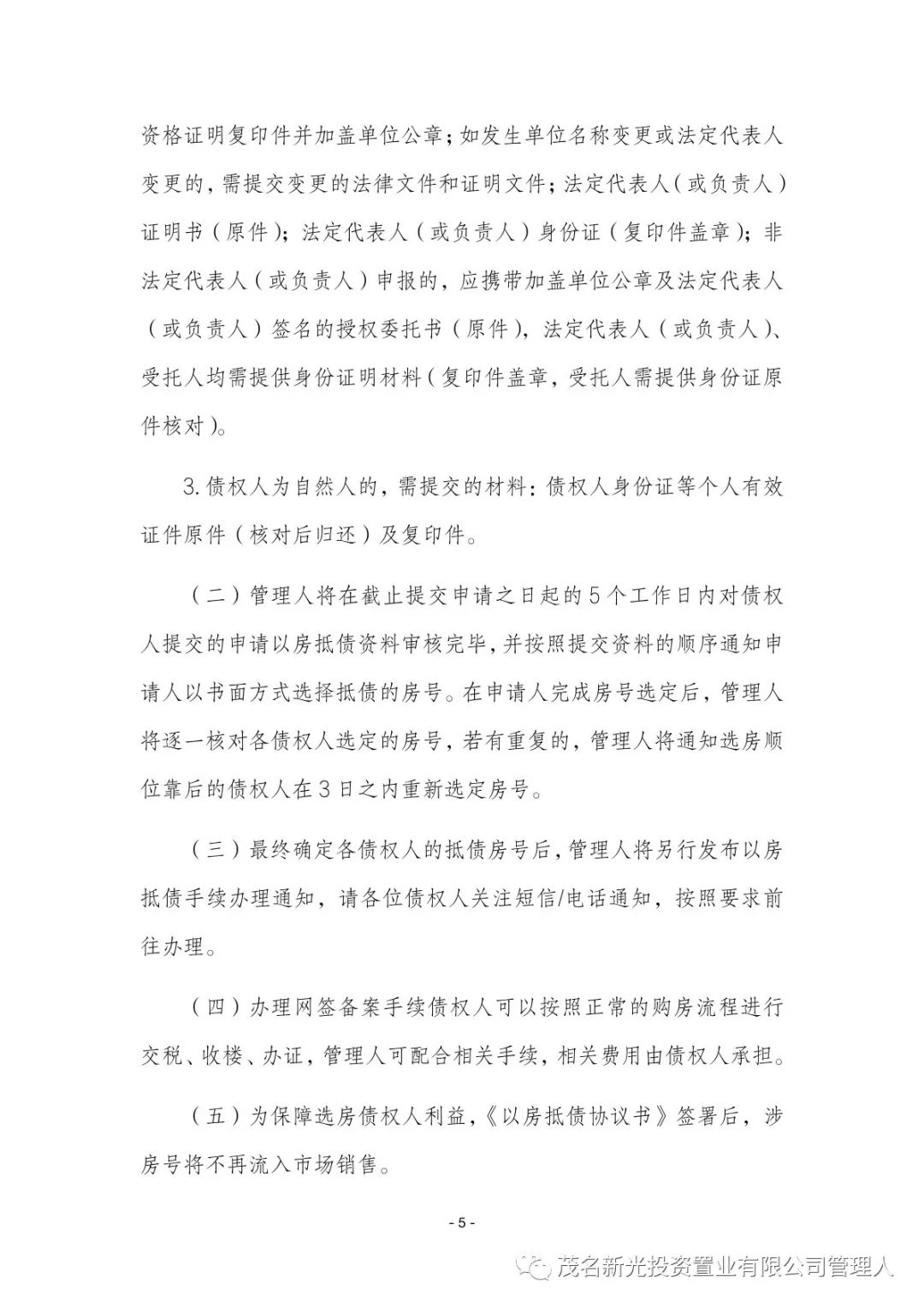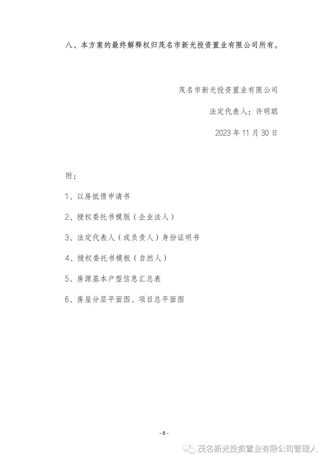关于茂名市新光投资置业有限公司(下称“新光公司”)破产重整一案,新光公司于2023年11月30日根据《茂名市新光投资置业有限公司重整计划》之有关规定,向管理人提交了《茂名市新光投资置业有限公司以房抵债的实施方案(一)》(下称“《以房抵债的实施方案(一)》”)。现管理人对《以房抵债的实施方案(一)》(附件)予以公示。