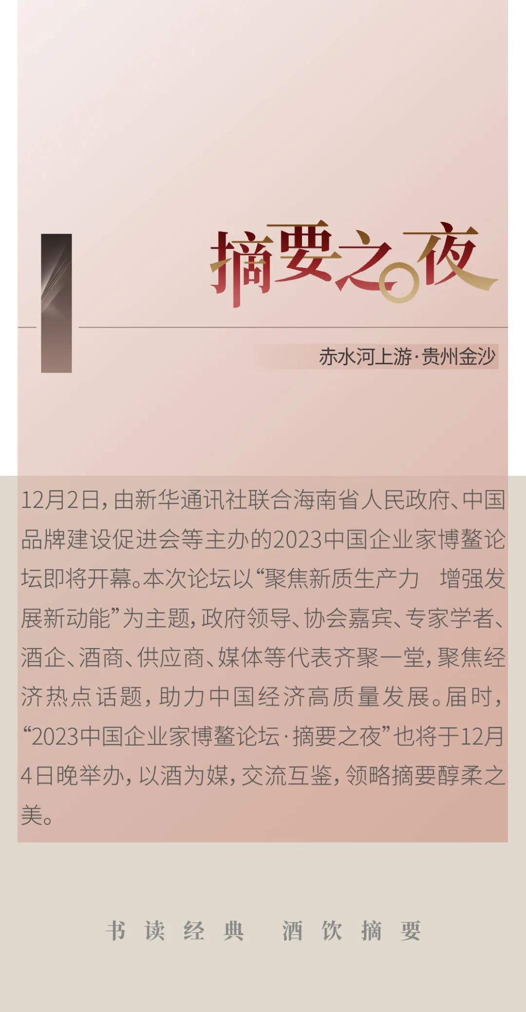 摘要作为金沙酒业双品牌战略的重要组成,通过差异化的视觉符号、品质风味、品牌定位,以及独特的战略IP运作,成功占位高端酱酒赛道,引领金沙酒业高质量发展之路。同时,也将在12月3日的中国新消费发展大会中,从博鳌出发的《时代摘要》IP再度亮相,传播中国实体经济的发展正能量,展现中国经济强大发展韧性与活力。