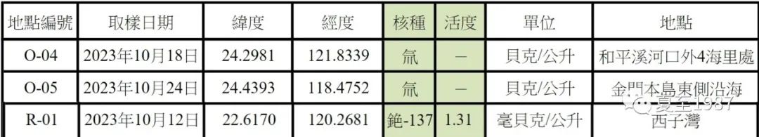 这个时候,公开渠道竟然很少找到理性讨论的内容,情绪输出的垃圾稿件倒是一大堆。我只能自食其力,自学放射性物质对人体危害相关知识,确定了经过ALPS系统处理后的核污染水中的主要有害物质两种,氚和铯-137,随后在东南某湾省发布的各海域海水采样数据中,找到如下图的氚和铯-137的放射量数据:
