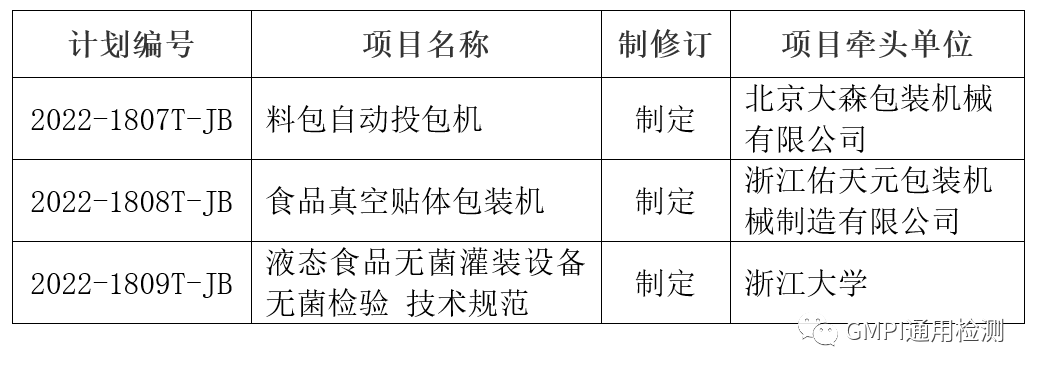 根据2022年12月30日工业和信息化部发布的2022年第三批行业标准制修订项目计划(工信厅科函[2022]312号),由全国食品包装机械标准化技术委员会归口的3项行业标准计划项目已获批。