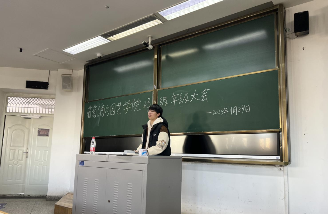 为帮助同学们适应学校生活,熟悉学校规章制度,做好大学四年生涯规划,葡萄酒与园艺学院于11月29日召开2023级年级大会。本次大会由辅导员曹洋主持,全体2023级葡萄酒与园艺学院本科生参加。