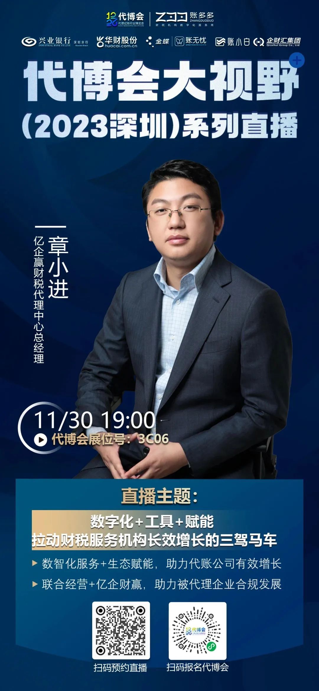 2023年11月30日晚上7点,本期为“1226代博会大视野”系列直播的第二十四期,特邀嘉宾为代博会赞助商亿企赢财税代理中心总经理 章小进,分享《数字化+工具+赋能 拉动财税服务机构长效增长的三驾马车》。本期【代博会】视频号近多人观看,感谢同行朋友一如既往的支持和收看。