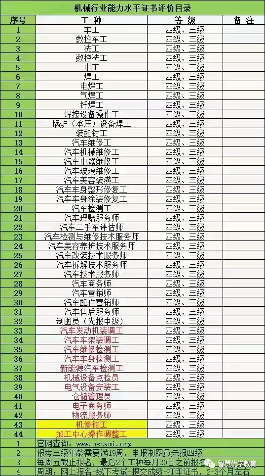 机械认定增设:电焊工、汽车检测工、汽车营销师、汽车配件营销师、汽车理赔服务师、汽车美容装潢工,汽车车身整形修复工,汽车车身涂装修复工周知。