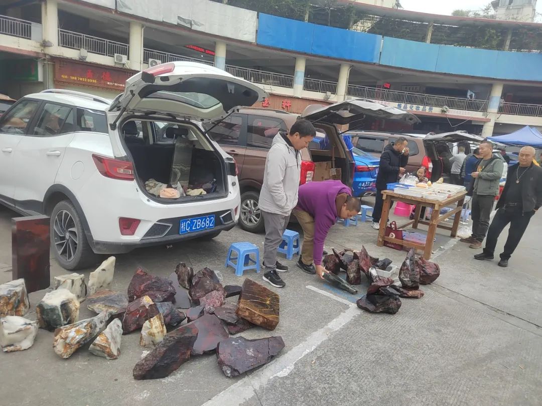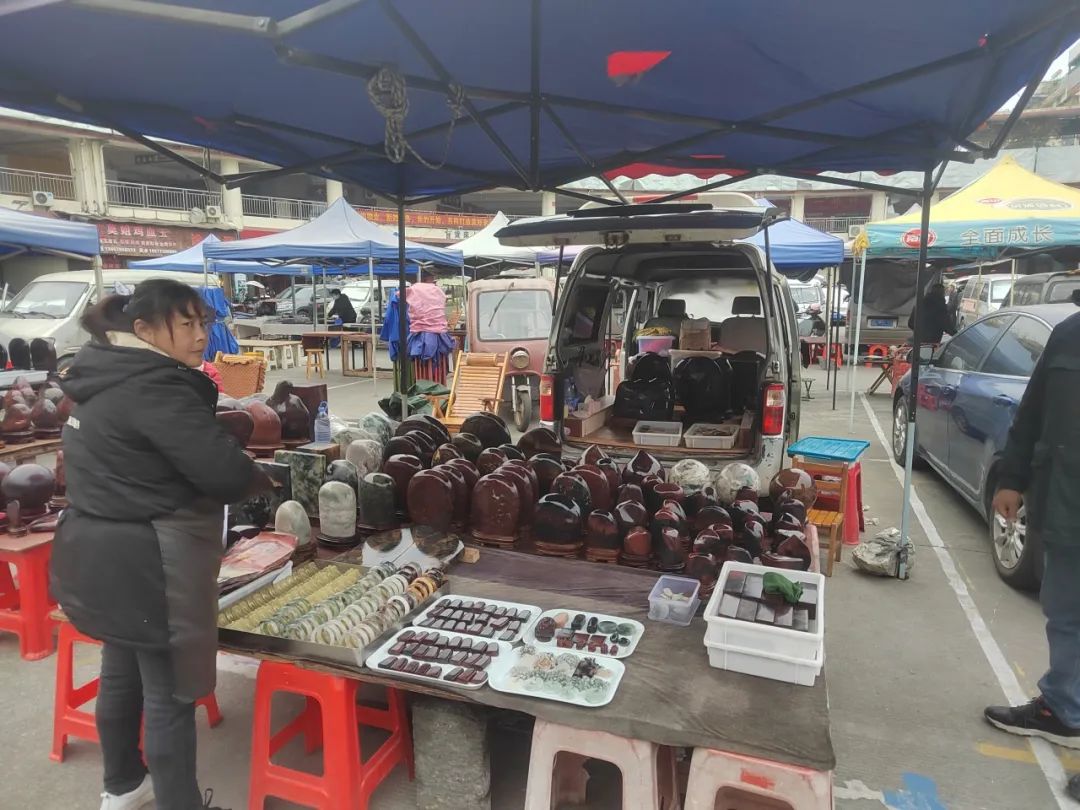 伴随着上世纪八十年代桂林旅游业国际化,国际上行销上百年的矿晶、化石和宝玉石产品,逐步从全国各地聚集到桂林国际旅游商贸城及周边区域,奇石早市应运而生并不断发展,逐步形成桂林矿晶奇石市场的雏形。为保留这个具有特殊意义的商贸方式,德天广场一直给予奇石早市发展的空间和地位,维持其市场鲜活度。为此南京矿博会代表团一并考察了桂林德天市场的奇石早市情况,深受启发,受益颇多。