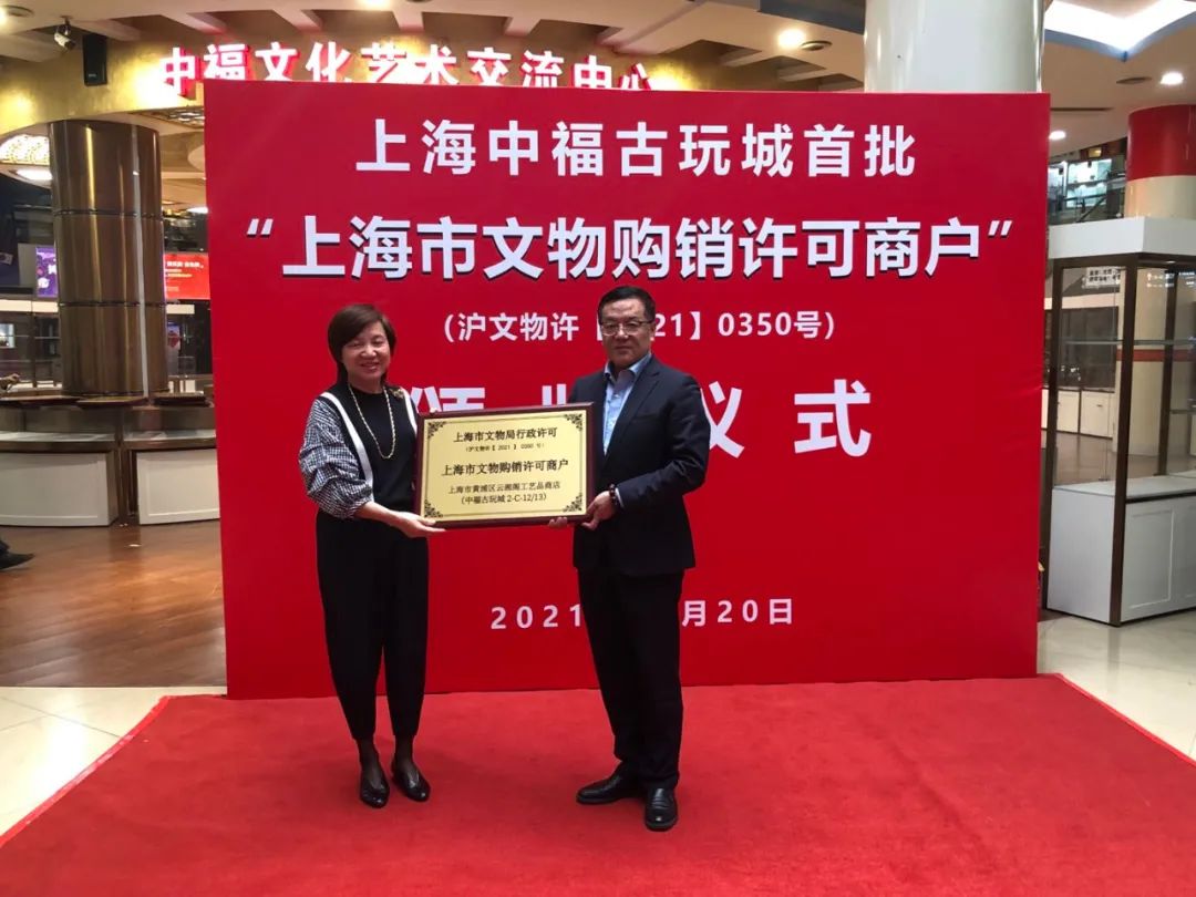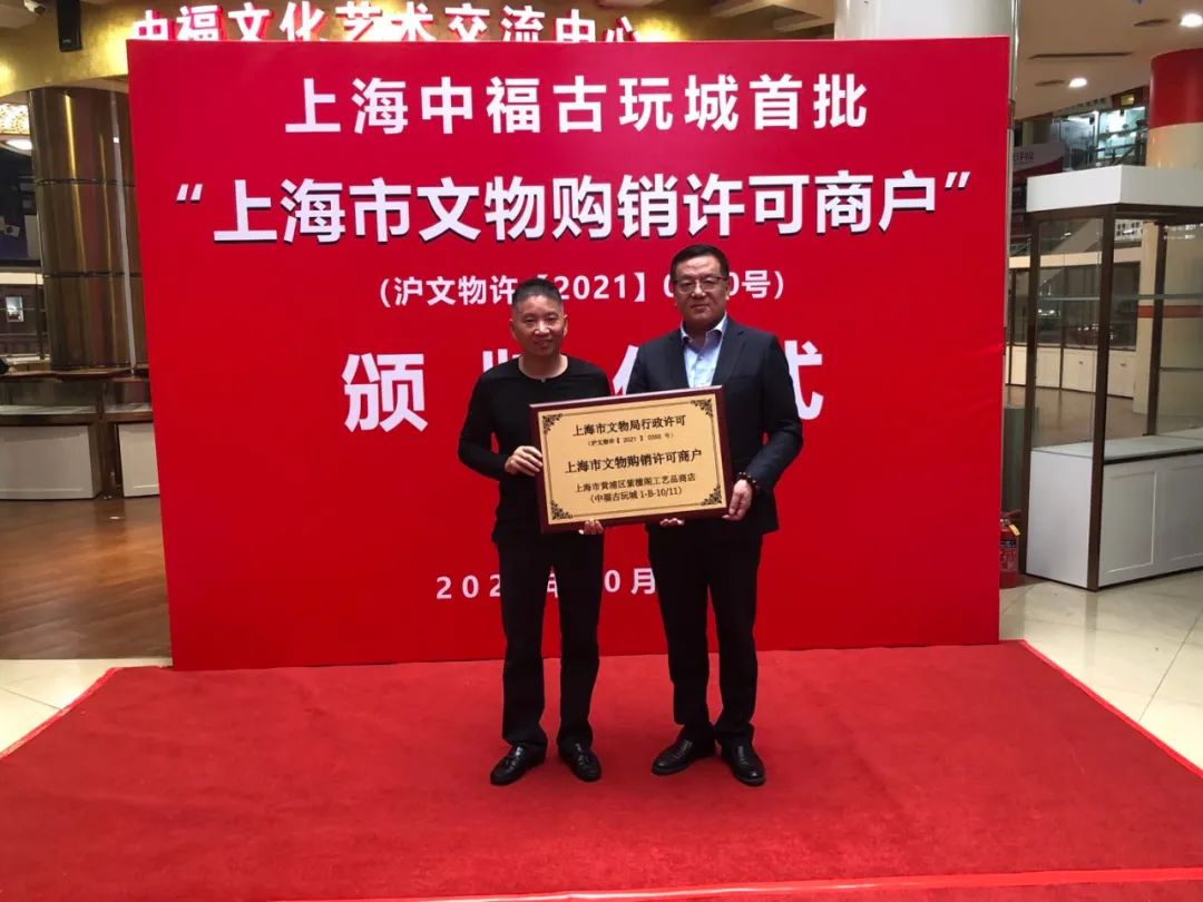 《文物保护法》规定了文物商店和文物拍卖企业两类文物经营主体,并明确除经批准的两类主体外,其他单位或者个人不得从事文物的商业经营活动。而实践中,古玩旧货市场中的商户经营文物的情况较为普遍。 中福古玩城总经理王佳先生为1-A-01上海市黄浦区泰艺堂工艺品商店颁发“上海市文物购销许可”的铜牌