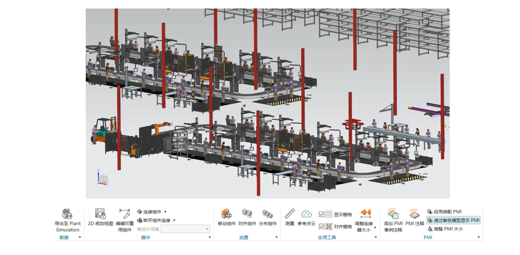 NX产线设计工具是西门子功能强大的制造布局设计的解决方案。它也提供了丰富的参数化设备库,包括台架、传送装置、安全设备和物料处理设备。借助NX,工程机械企业可以快速设计和可视化生产线的布局,并将其与制造规划相关联。通过将每个生产步骤指定为管理单个制造资源(例如机器人或夹具),可以轻松优化流程。通过使用参数资源库执行准确的影响分析并推动高效的变更管理。