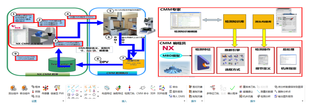 NX CMM数控测量编程可简化整个数控测量程序的开发过程,使用模型附带的产品和制造信息 (PMI)来自动生成程序。生成经过后处理的输出结果,包括DMIS 标准和针对特定机器的格式。借助集成式数控测量分析,用户可以重新读回测得的数据以进行比较和研究。NX拥有CMM所需要的设计工具,以及PMI创建和关联工具,CMM检验编程产品完全嵌入到NX中。故NX中的CMM工具能够非常直观地进行测量编程以及三坐标机床仿真。NX CMM模块具有以下特点: