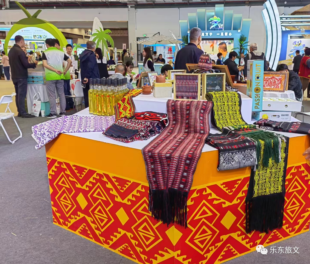 乐东展馆的设计充满了浓厚的少数民族特色,黎锦、山兰酒、大安剪纸都充分展示了乐东的旅游文化。
