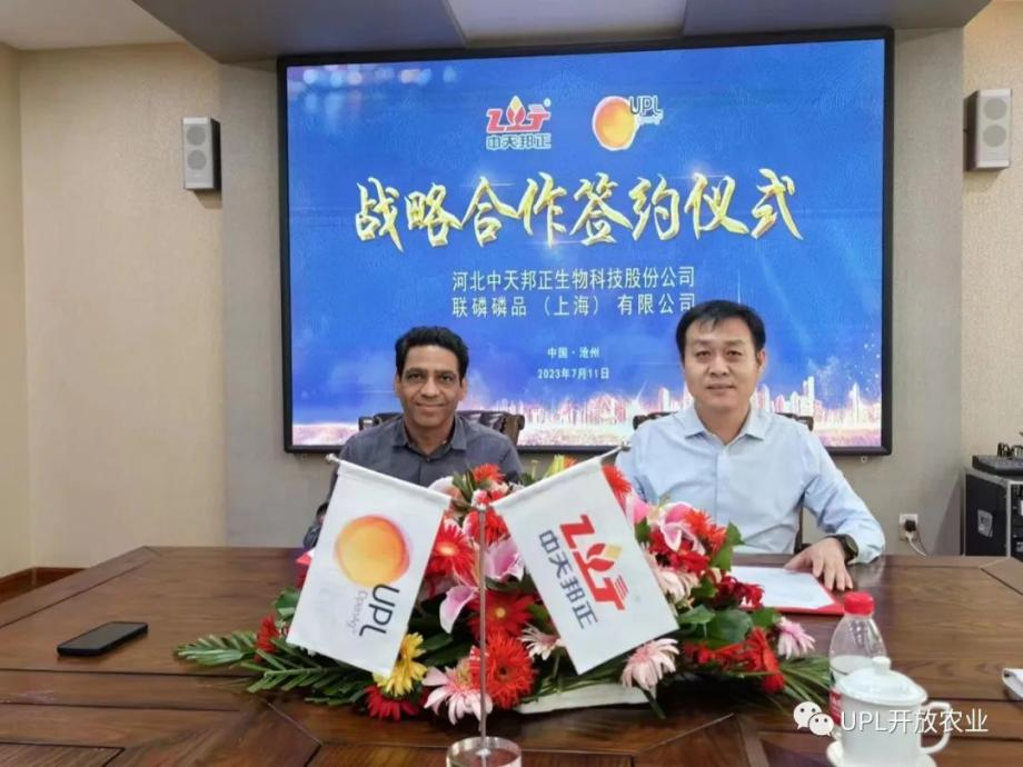 UPL作为全球五大农化跨国公司之一,是解决土传和种传病害的优秀技术引领者,也是新一代甲氧基丙烯酸酯类杀菌剂提供商,拥有最先进的Disperss造粒技术。UPL大中华区负责人Devendra Gangwar(甘德伟)先生表示,中天邦正一直致力于环境保护和可持续发展,企业理念和愿景与UPL中国高度一致,双方合作可以实现共赢,将携手打造和推动绿色农业。中天邦正董事长陈玉龙表示,此次与UPL中国的合作,既实现了产业链上下游的资源互补与战略协同,又有利于提高产品知名度,提升产品的竞争力。双方携手是新起点、新启航。再出发,站在新的起点上,中天邦正将继续秉持创新、责任和服务的核心价值观,与广大合作伙伴共同推动农药行业的持续发展,努力实现更加高效、环保的农药产品和服务。同时,中天邦正将加强研发力度,致力于为全球农业生产提供更加优质、安全的农药产品,为绿色农业的发展贡献力量。